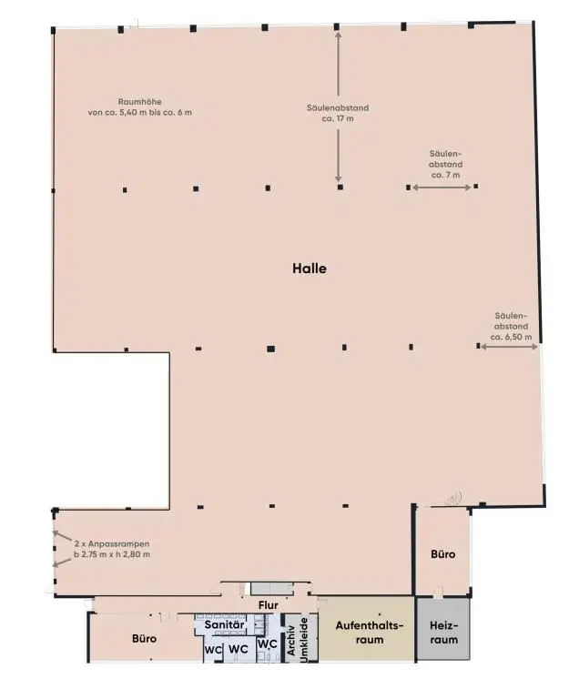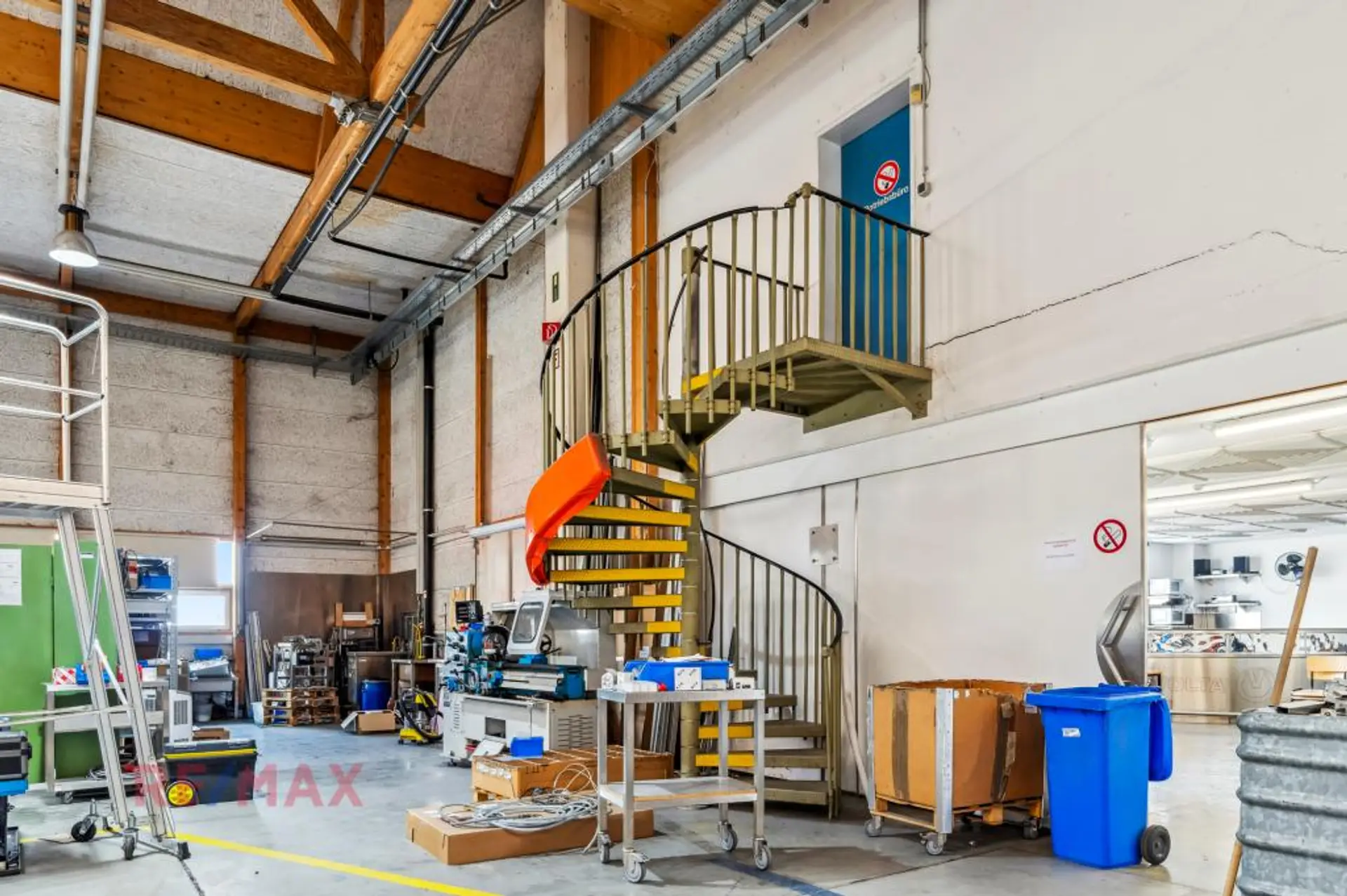 Die ca. 6 Meter hohe Halle ist mit einer effizienten Luftheizung ausgestattet und verfügt über zwei Anpassrampen – perfekt für eine reibungslose Anlieferung. Eine interne Wendeltreppe verbindet die Halle direkt mit dem Obergeschoss, wo sich die klimatisierten Büroräume befinden. Diese überzeugen durch ihre großzügige Gestaltung und flexible Aufteilung. Beheizt wird die gesamte Immobilie über eine Gaszentralheizung.