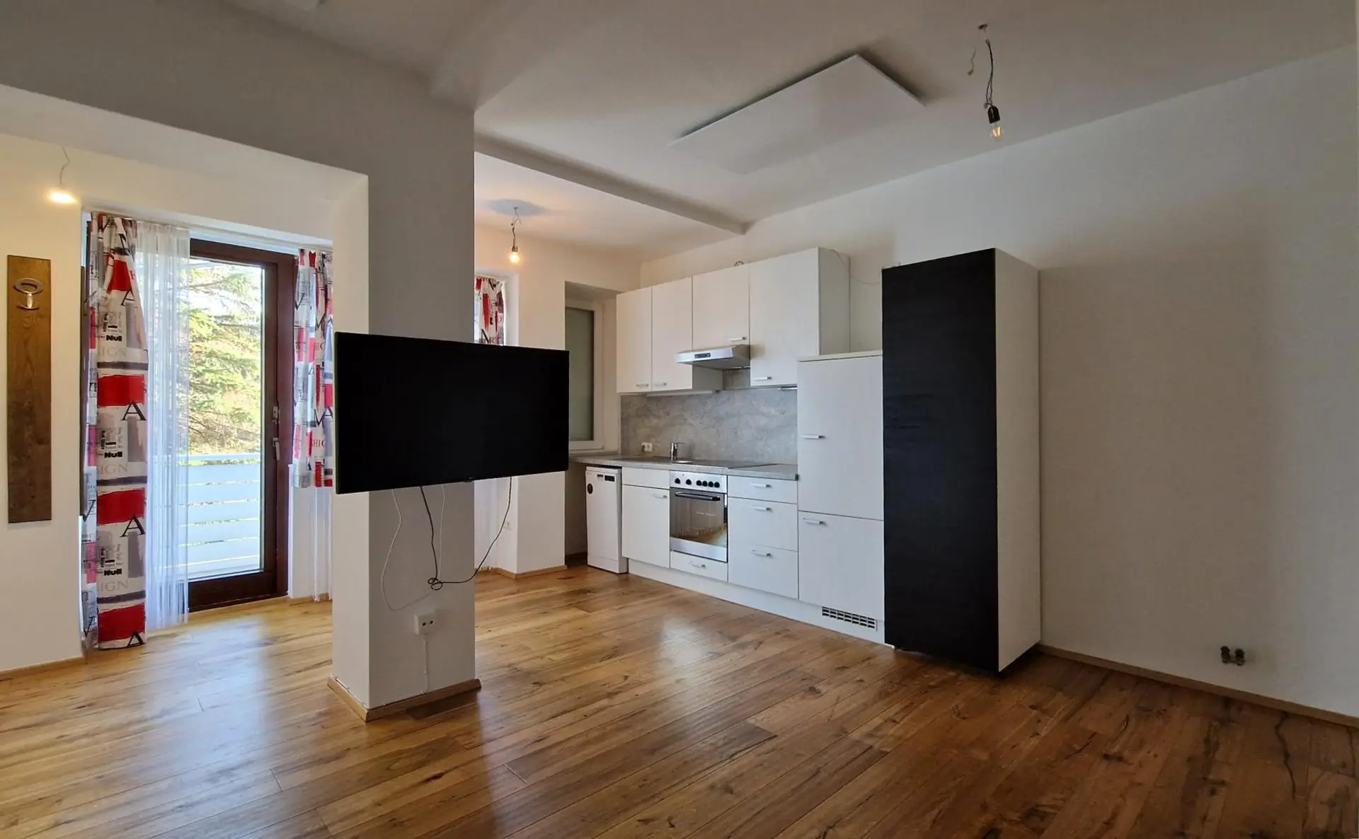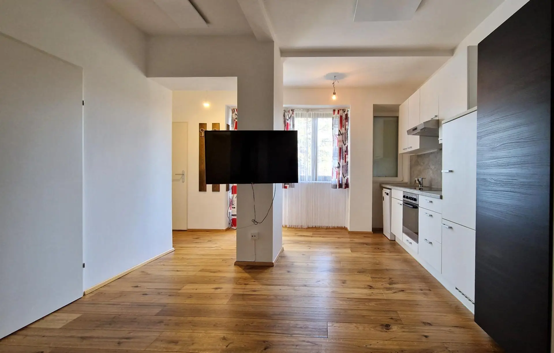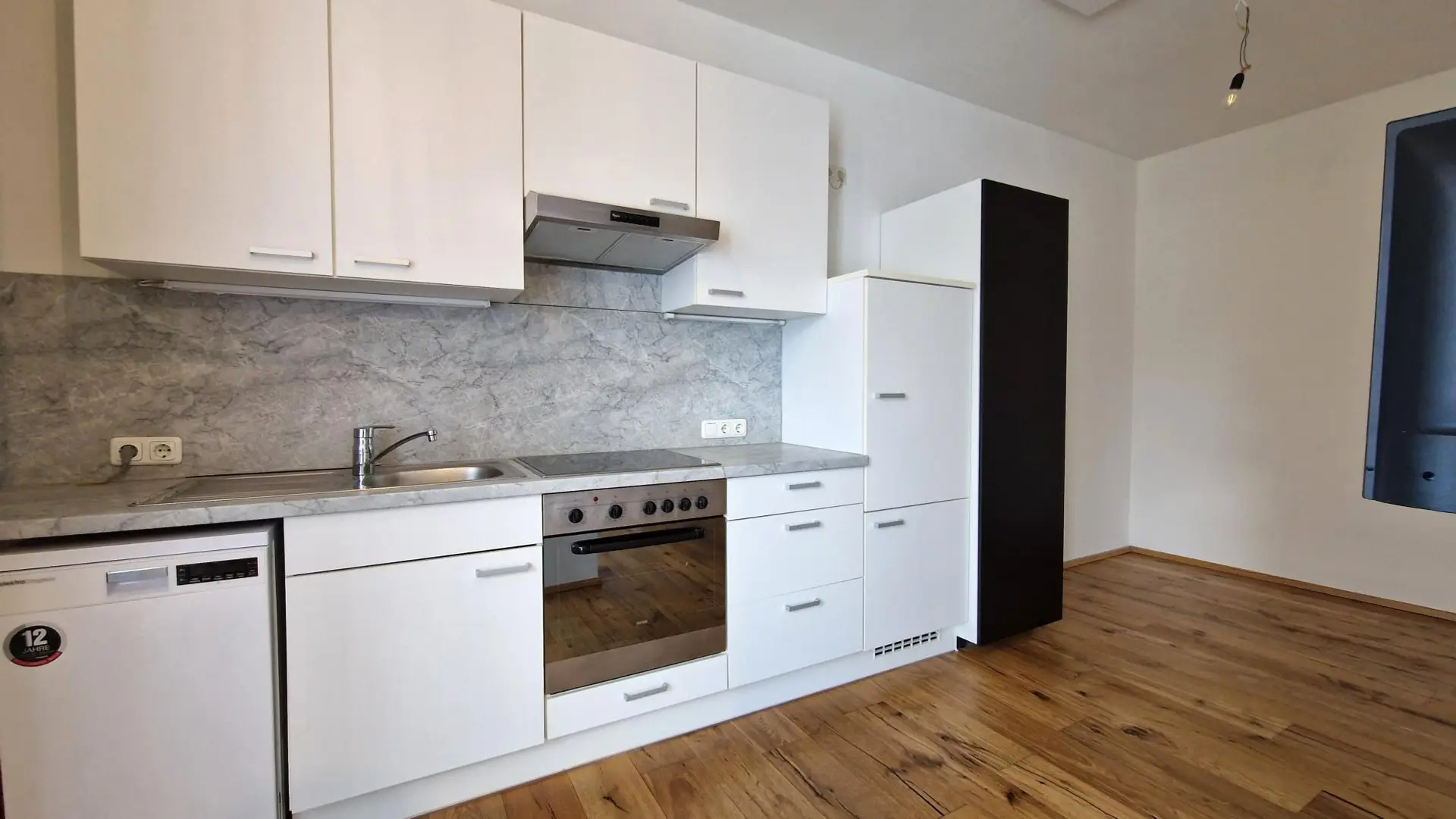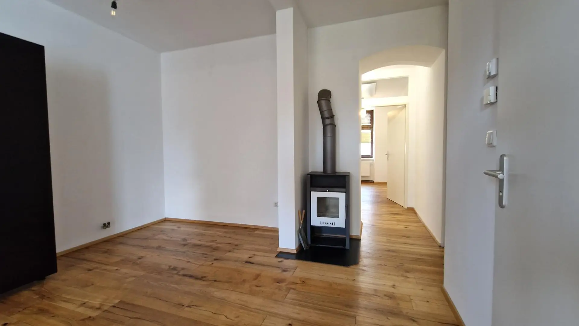 Das Herzstück der Wohnung bildet der moderne Wohn- und Essbereich, der mit einer integrierten Küche inklusive Elektrogeräten ausgestattet ist. Ein gemütlicher Schwedenofen sorgt hier für eine besonders behagliche Wohnatmosphäre und lädt zu entspannten Stunden ein.