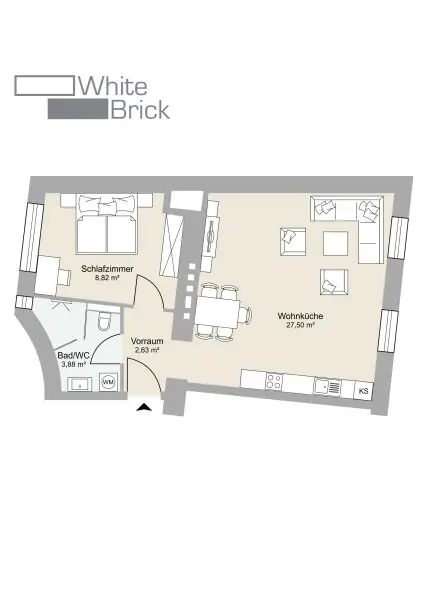 - Wohnzimmer: 27,50m2 (mit Anschlüssen für Wohnküche)