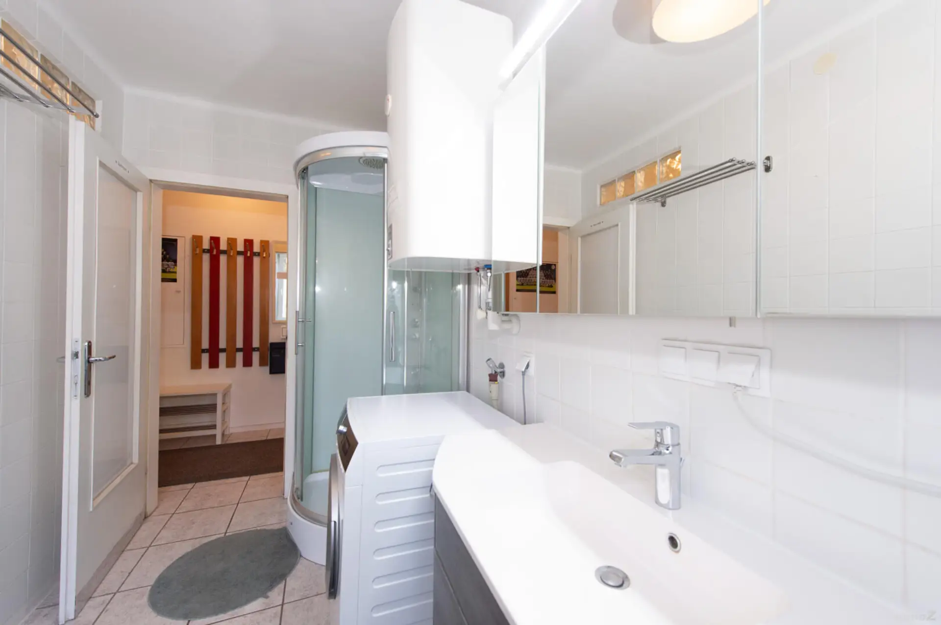 Ein Badezimmer mit Dusche und Fenster sorgt für angenehmes Tageslicht und gute Belüftung. Ergänzt wird die Wohnung durch zwei separate WCs, einen praktischen Abstellraum sowie ein eigenes Kellerabteil.