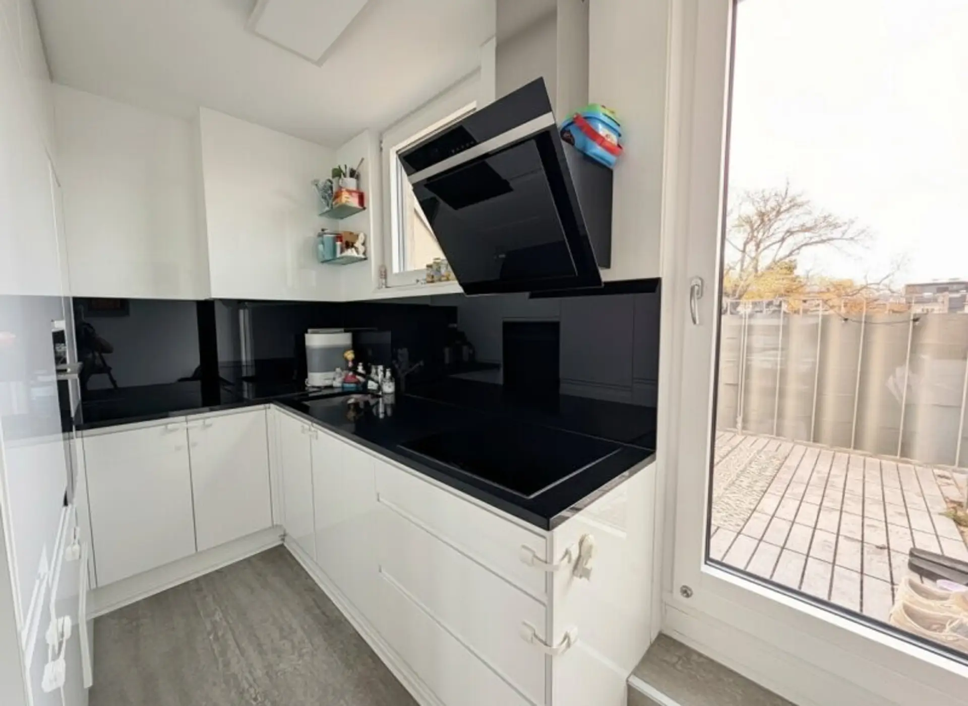 Der offene Wohnbereich mit teilintegrierter Küche und großflächigen Fensterfronten führt direkt auf die sonnige, westseitige Terrasse (ca. 10 m²).