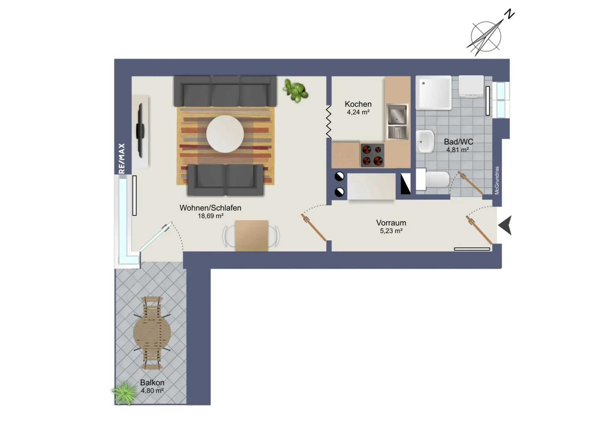 - Wohn-/Schlafzimmer: 18,69 m² mit Balkonzugang (Balkon 4,80 m²)