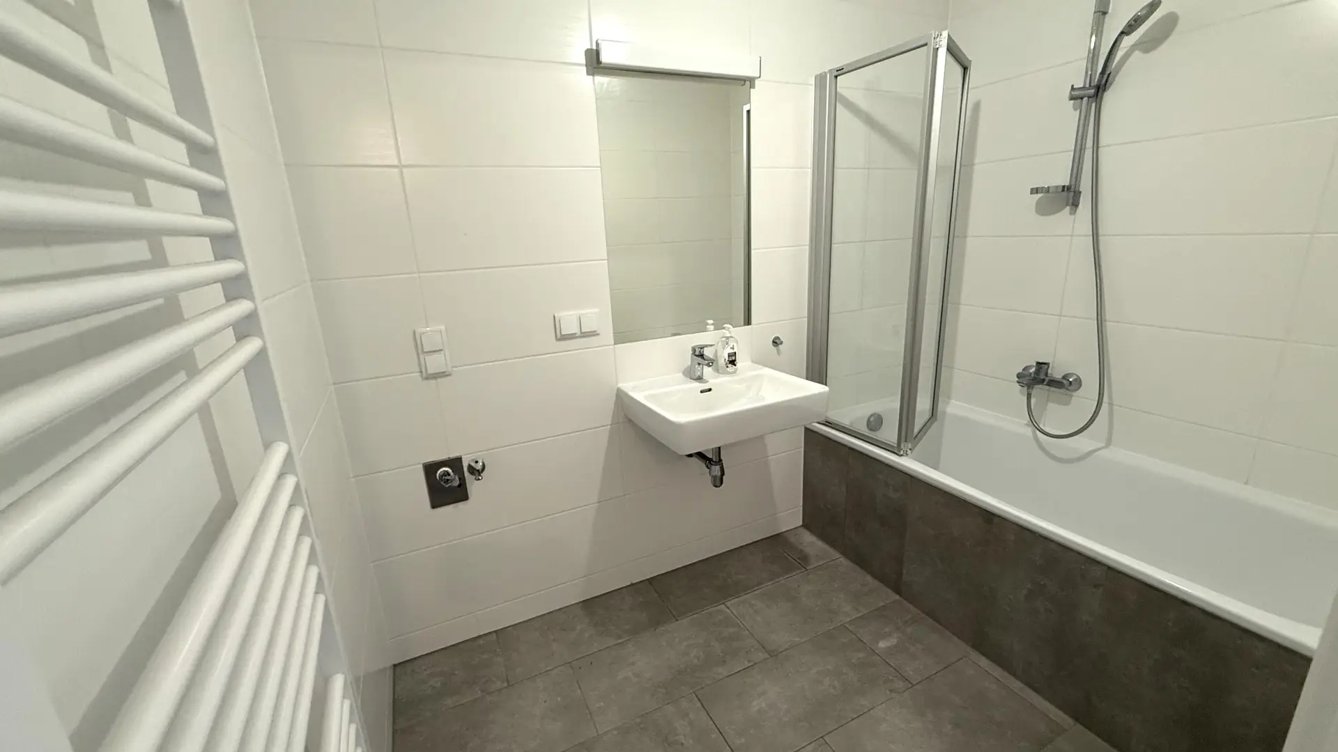 • Bad mit Badewanne, Waschtisch, Waschmaschinenanschluss, Handtuchheizkörper und WC
