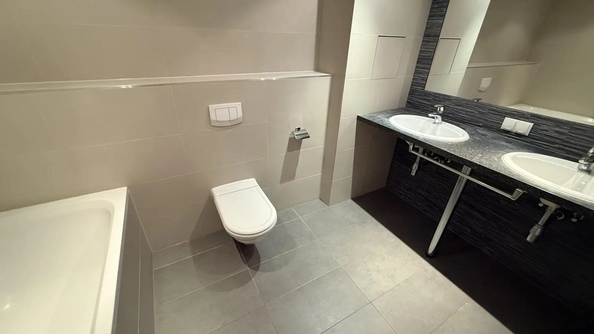 • Badezimmer mit Badewanne, Doppelwaschbecken und WC