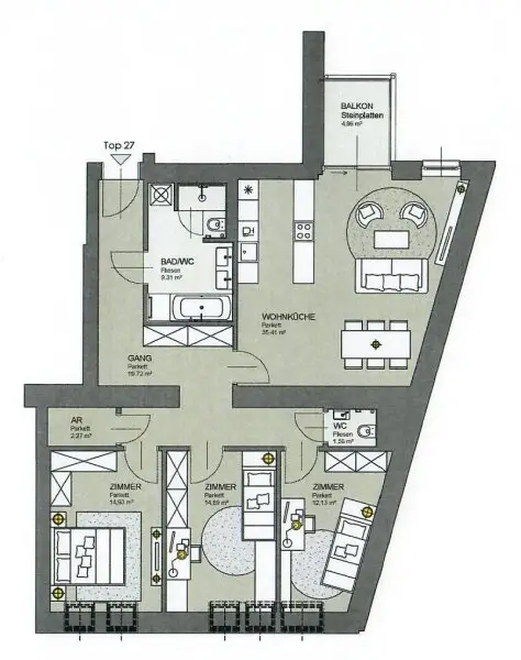 - 3 bedrooms (12.13 m²/14.69 m²/14.93 m²)