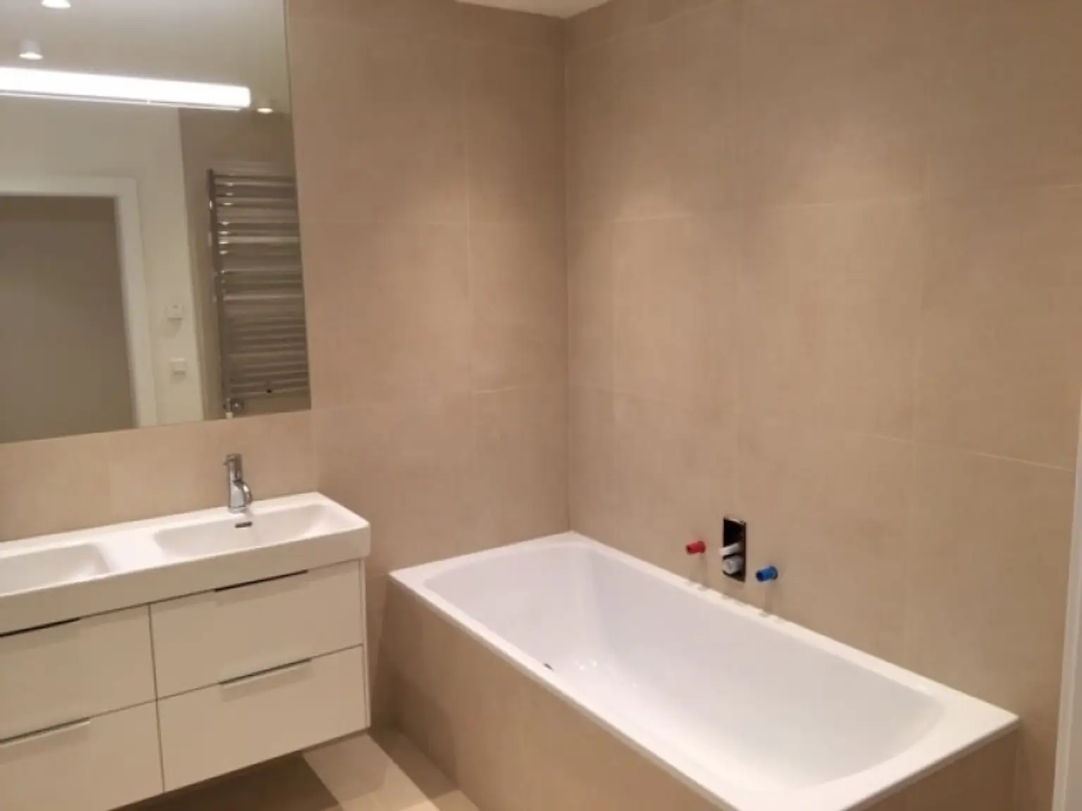 - bathroom with double sink, bathtub, shower, WC, and washing machine connection