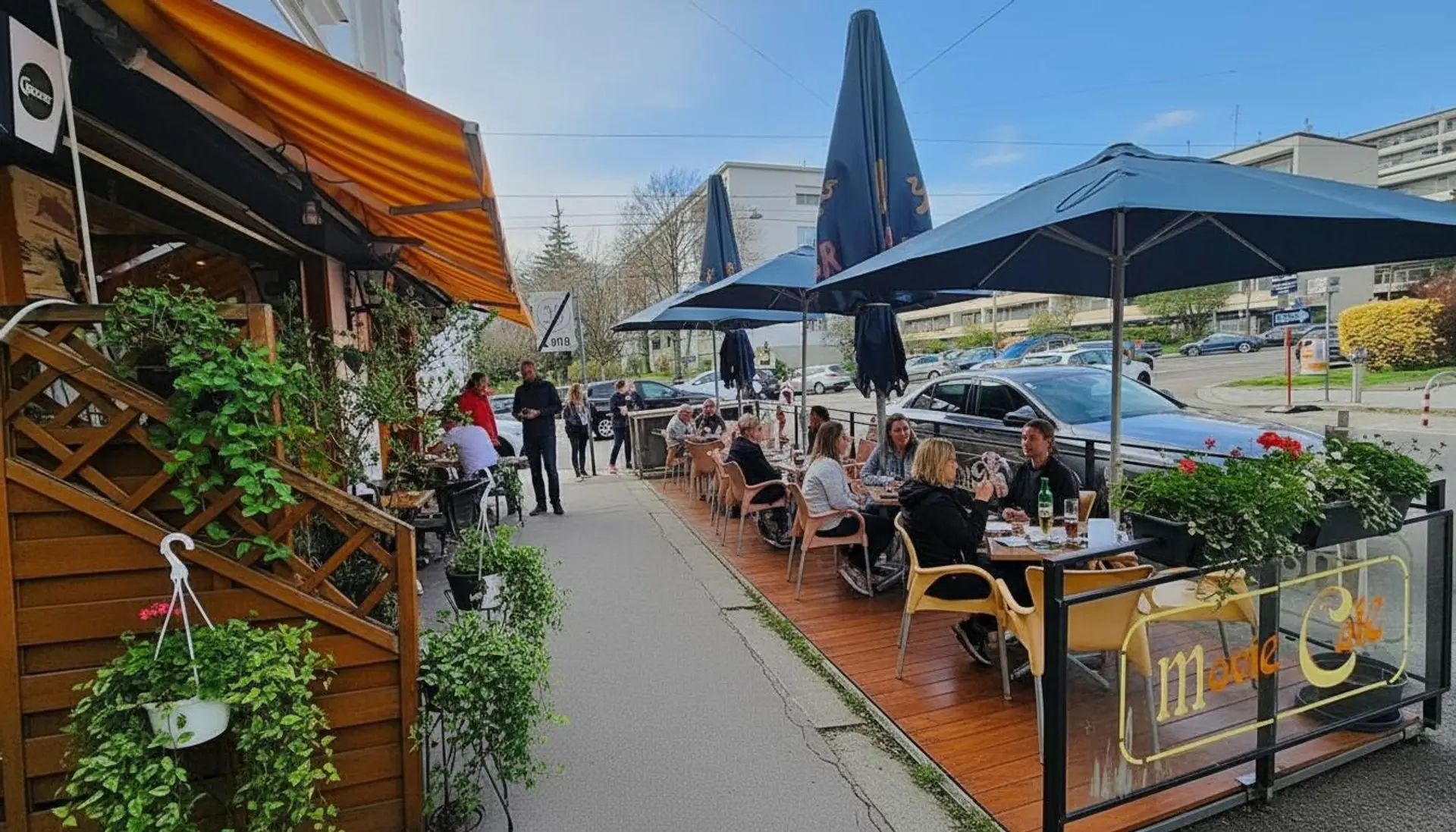 Der Gastgarten mit großen Gastroschirmen mit ca. 35 Plätzen darf ganzjährig