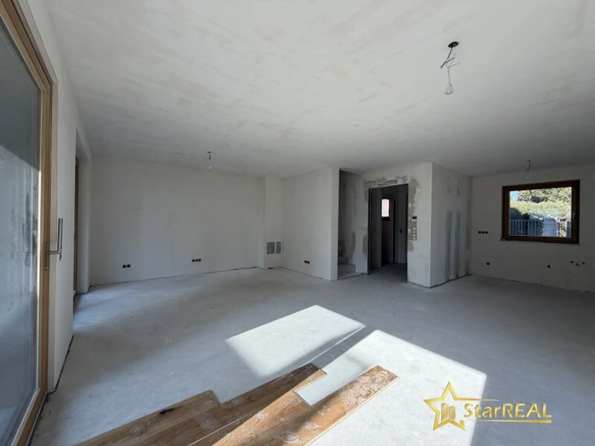 Vorzimmer, Gäste-WC sowie großzügiger Wohn- und Essbereich mit integrierter Küche und direktem Zugang zur Terrasse.