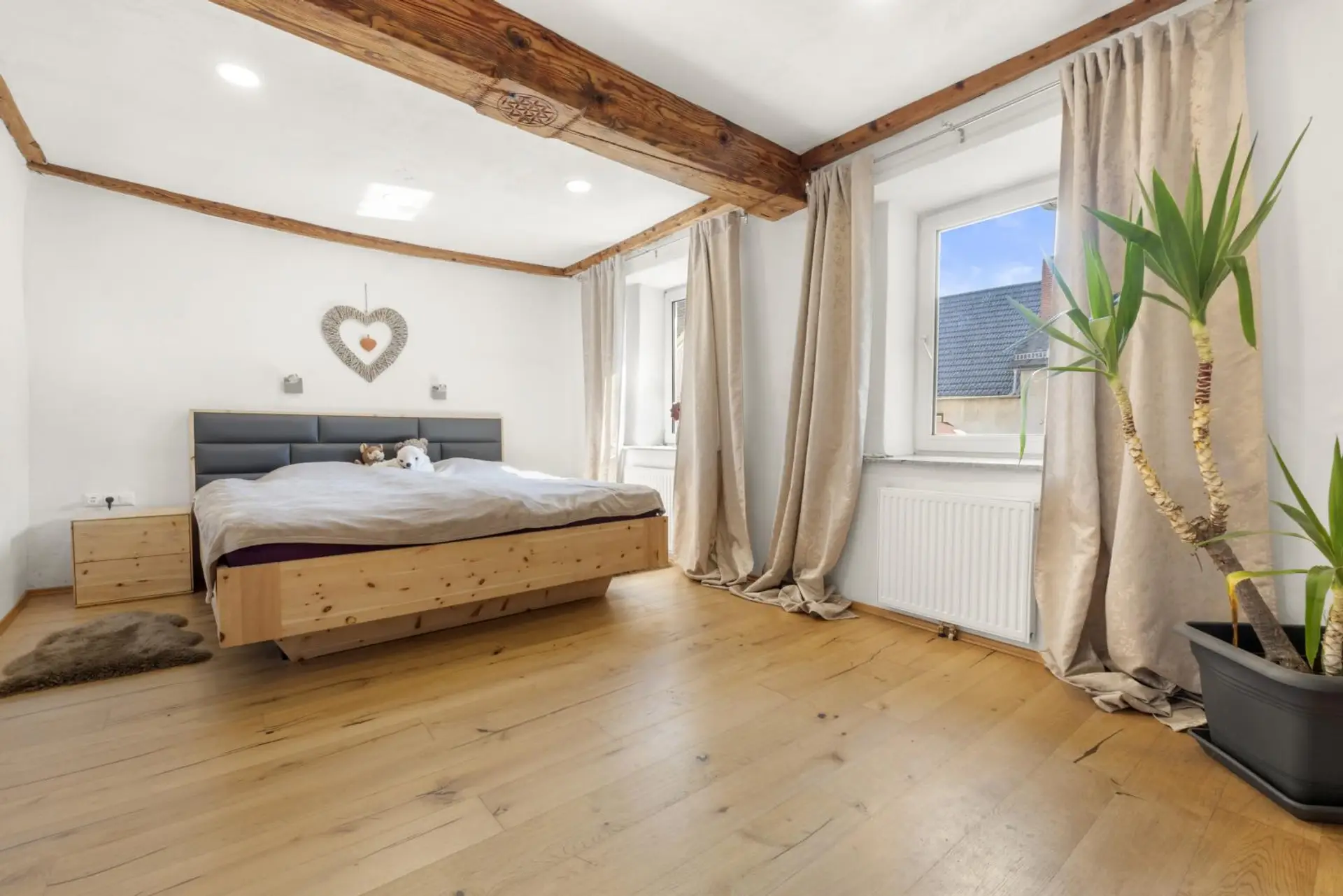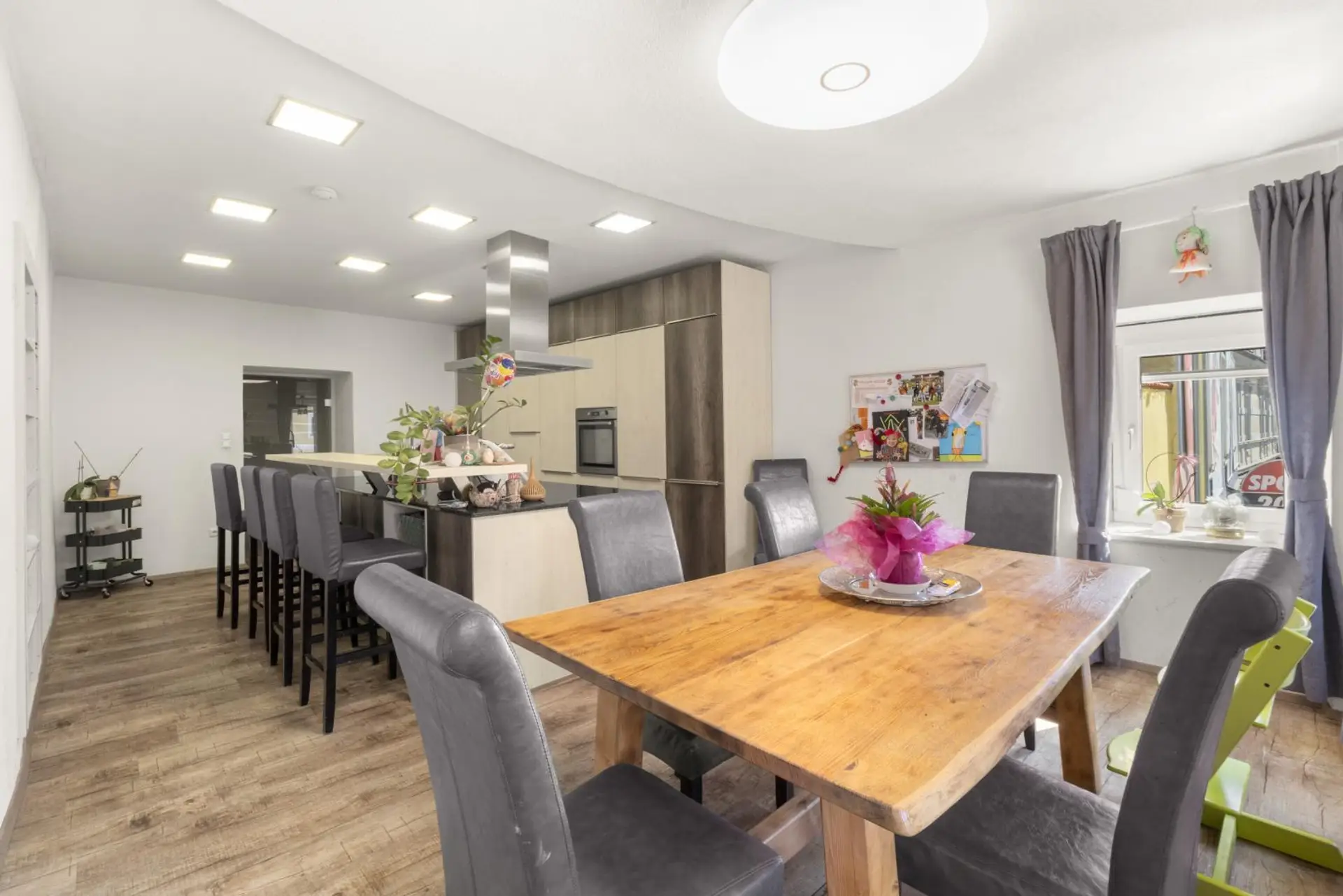 Das Gebäude wurde massiv errichtet und überzeugt durch hochwertige Ausstattungsmerkmale wie eine moderne Zentralheizung, die mit umweltfreundlichen Pellets betrieben wird. Die Fenster im Obergeschoss sind aus robustem Kunststoff gefertigt und verfügen über Dreifachverglasung, was für optimale Energieeffizienz und ein angenehmes Wohn- und Arbeitsklima sorgt.