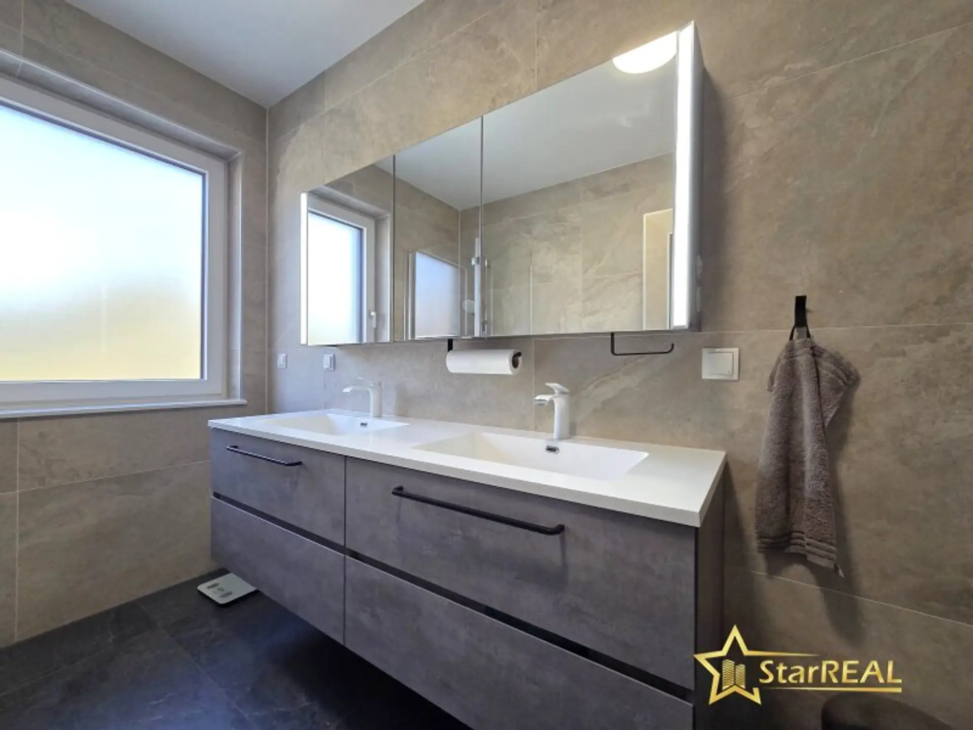 * Badezimmer 1 im Obergeschoss: Badmöbelset mit Doppelwaschbecken samt Unterschrank und Spiegelschank, Einbau-Regal