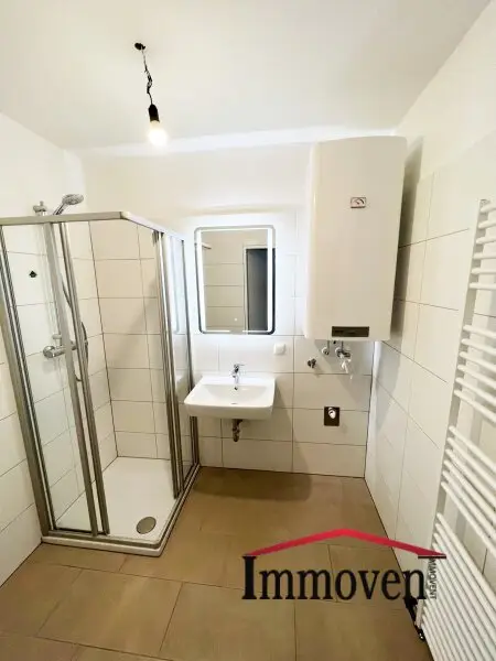 Im Badezimmer befindet sich eine moderne Dusche und ein Anschluss für die Waschmaschine. Ein Abstellräume bietet noch zusätzlichen Stauraum für Dinge des täglichen Bedarfs.