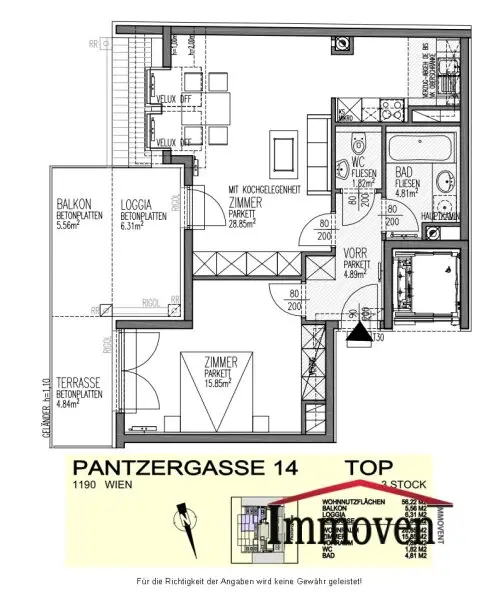 Die 2-Zimmerwohnung befindet sich im 3. Obergeschoss (Lift vorhanden), bietet eine Nutzfläche von ca. 56 m² und eine große Freifläche (Loggia, Terrasse, Balkon).