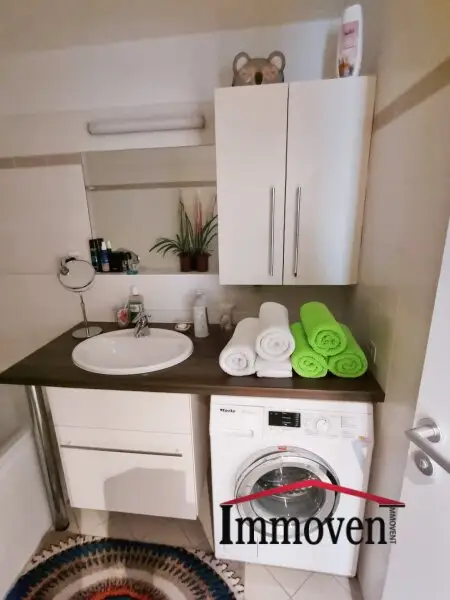 - Badezimmer mit Badewanne und Waschmaschinenanschluss