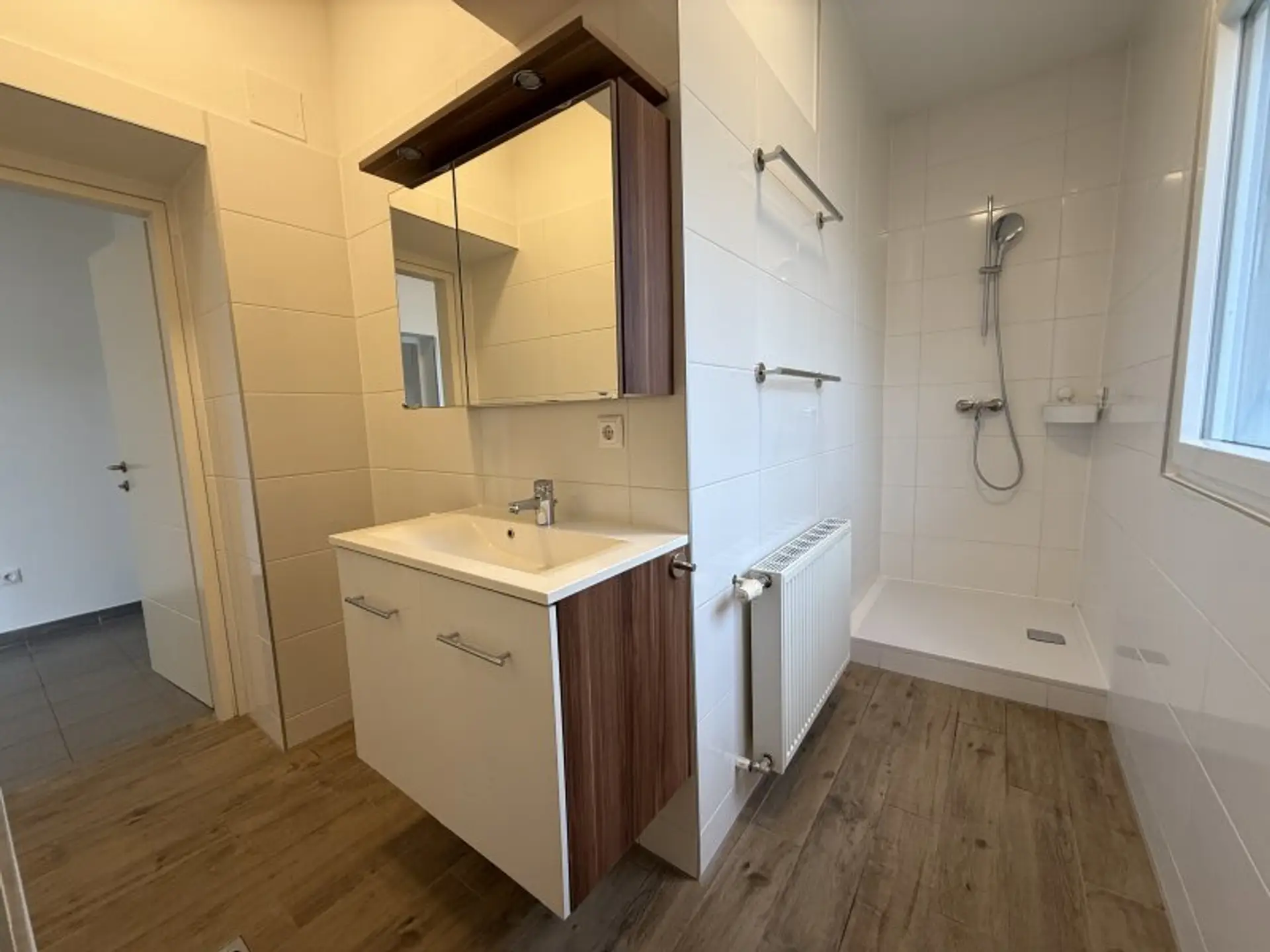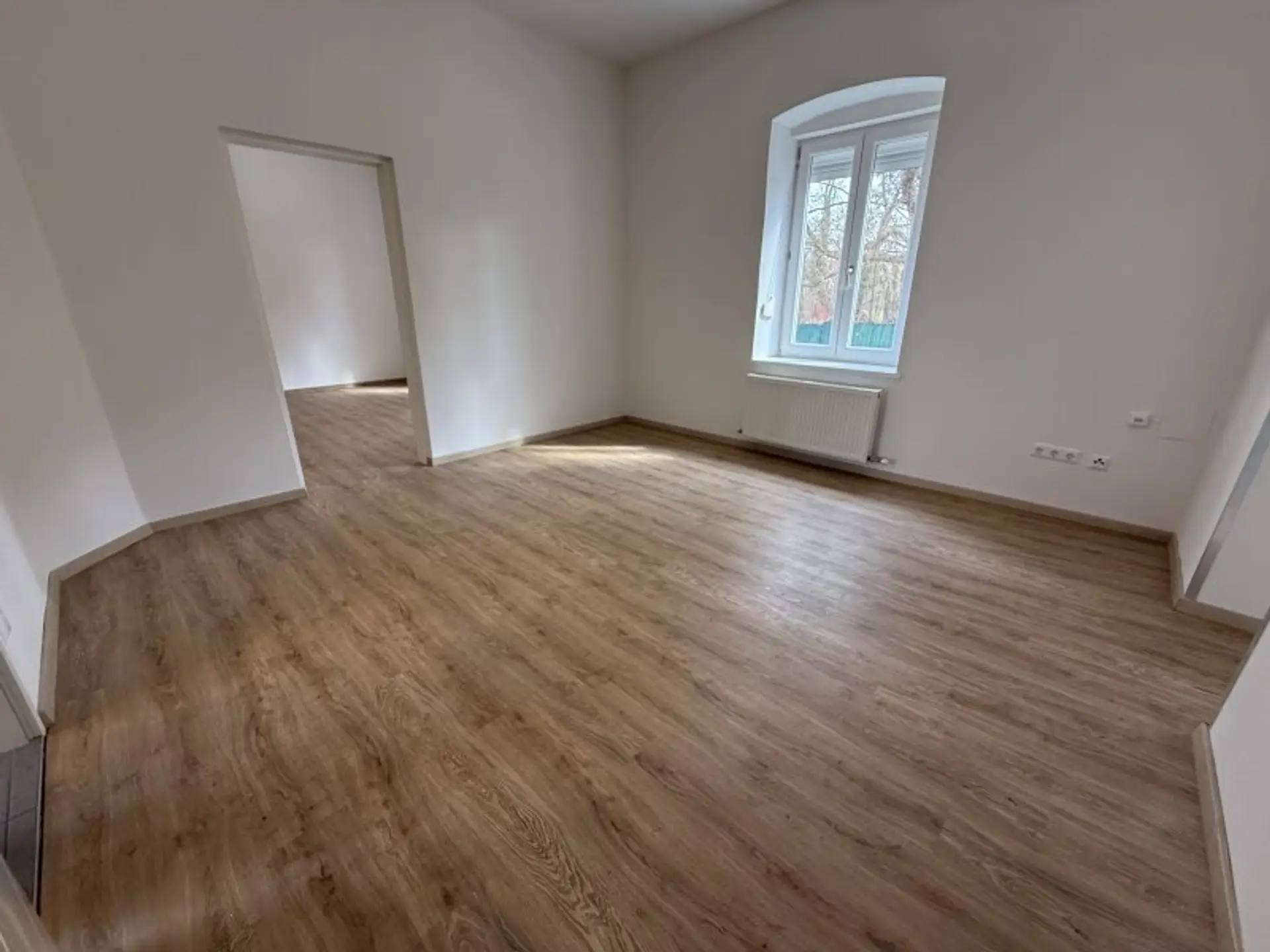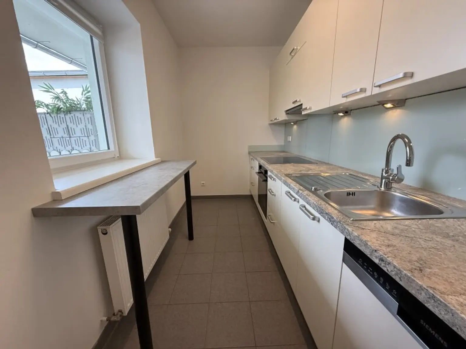Barrierefreies Erdgeschoss / zentraler Vorraum + 2 geräumige Zimmer + 1 Schlafzimmer + separate komplett ausgestattete Küche samt Echtglas-Rückwand + Badezimmer mit Dusche, WC und Waschmaschinenanschluss + Gemeinschaftsgarten mit Sitzgelegenheiten vor der Wohnungstür + Kfz-Abstellplatz / € 844,- inklusive Betriebskosten und USt.