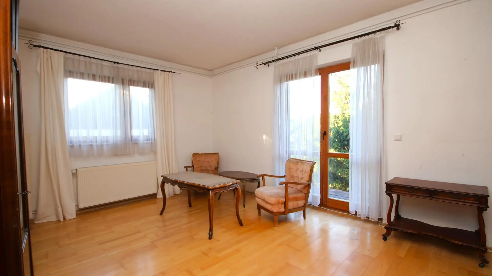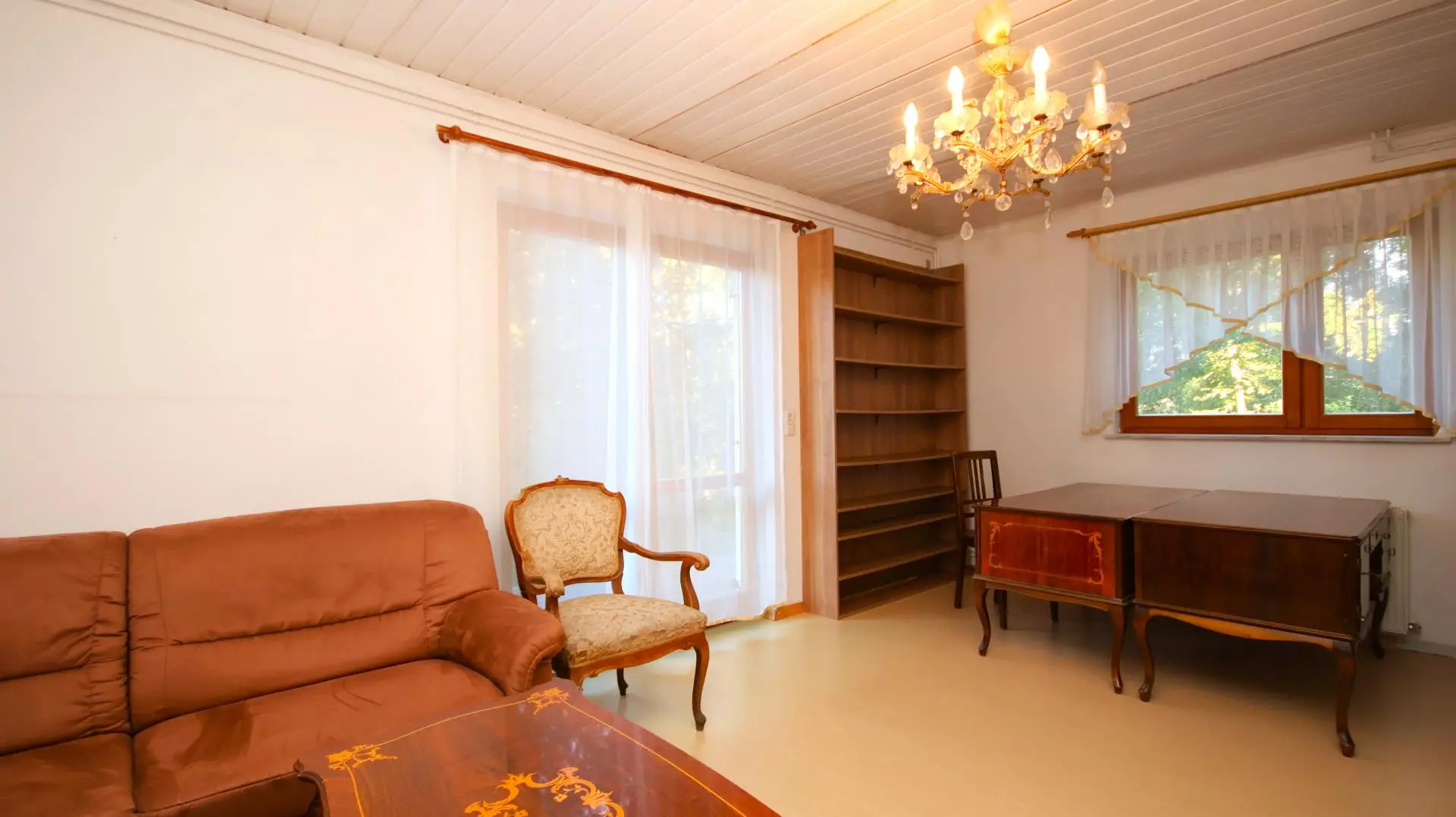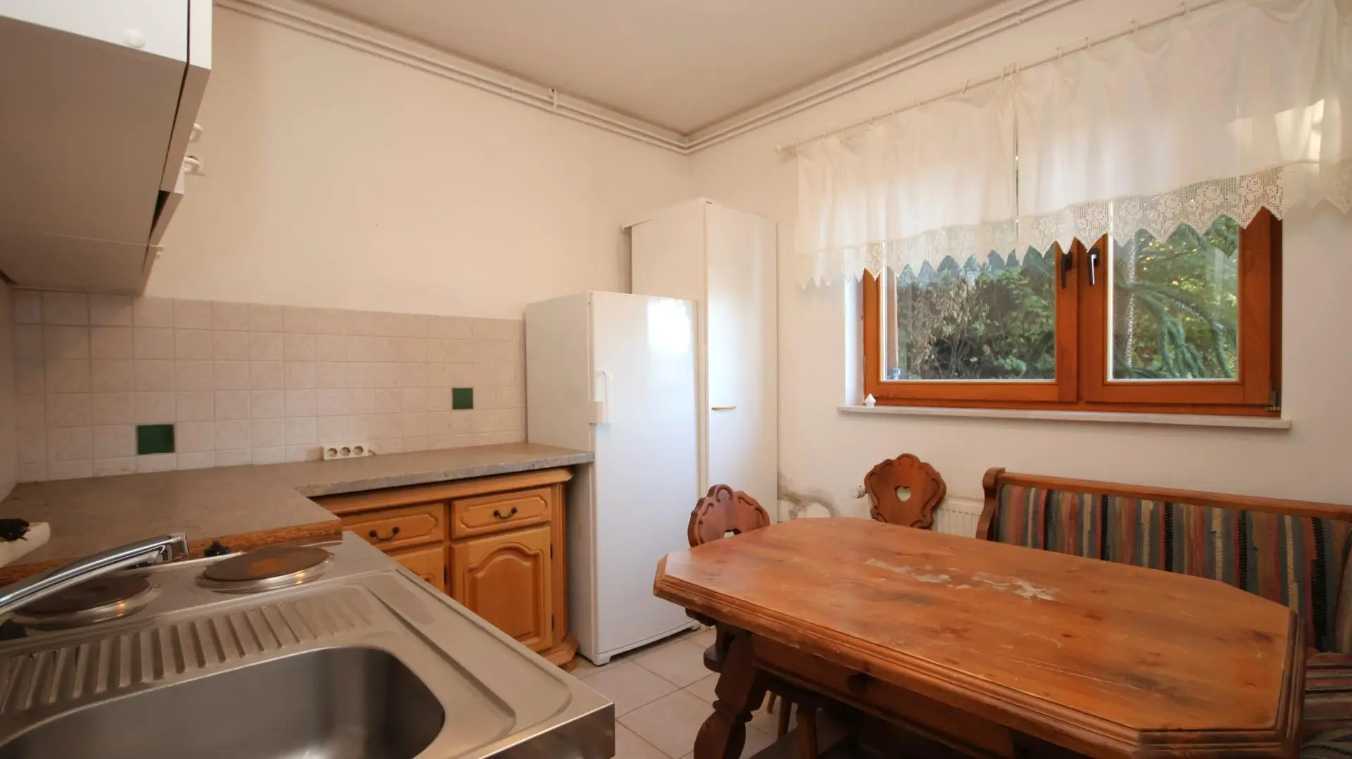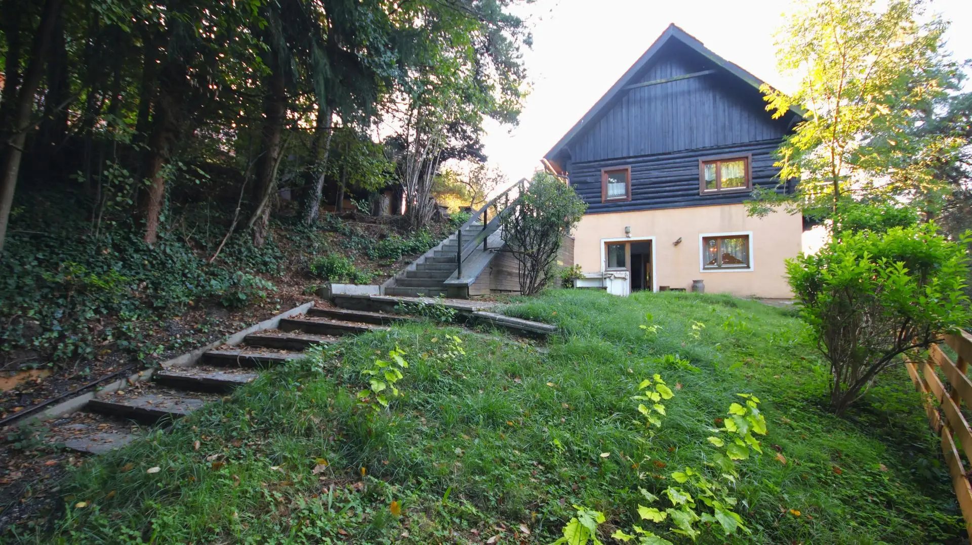 Das Kellergeschoss, über eine Verbindungstreppe vom Erdgeschoss oder den davorliegenden Garten erreichbar, gliedert sich in einen weiteren Vorraum, zwei Schlafzimmer, eine Küche, ein Badezimmer mit WC sowie einen praktischen Abstell- bzw. Arbeitsraum. An der Westseite des Gebäudes eröffnen sich auf beiden Etagen jeweils großzügige Balkone - diese sind stark sanierungsbedürftig und derzeit nicht begehbar, wurden bei der Bewertung der Immobilie berücksichtigt und der Kaufpreis entsprechend angepasst.