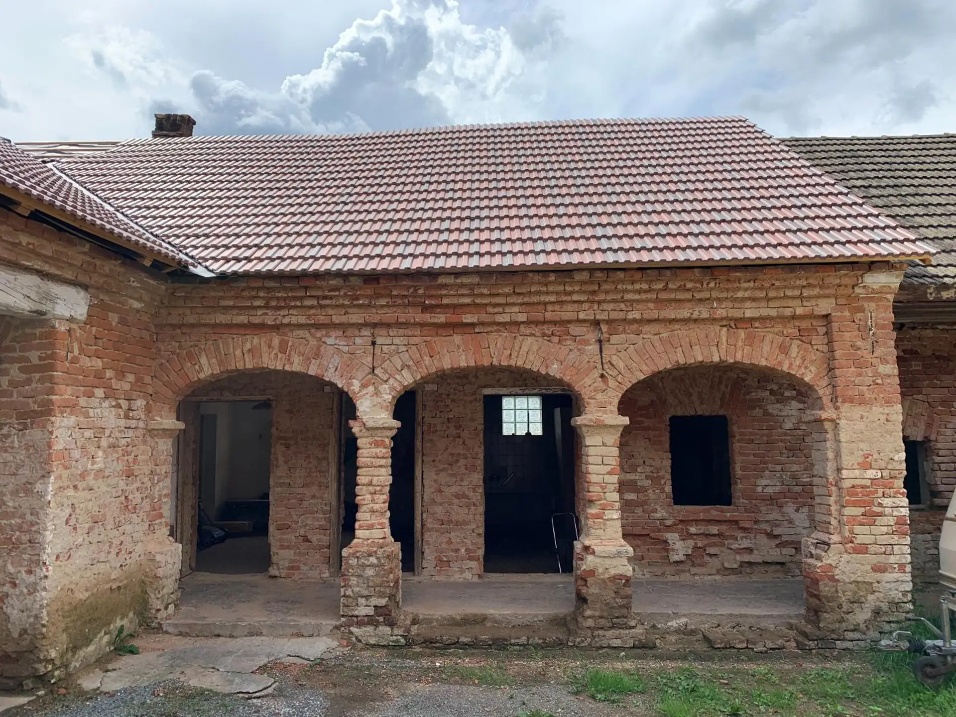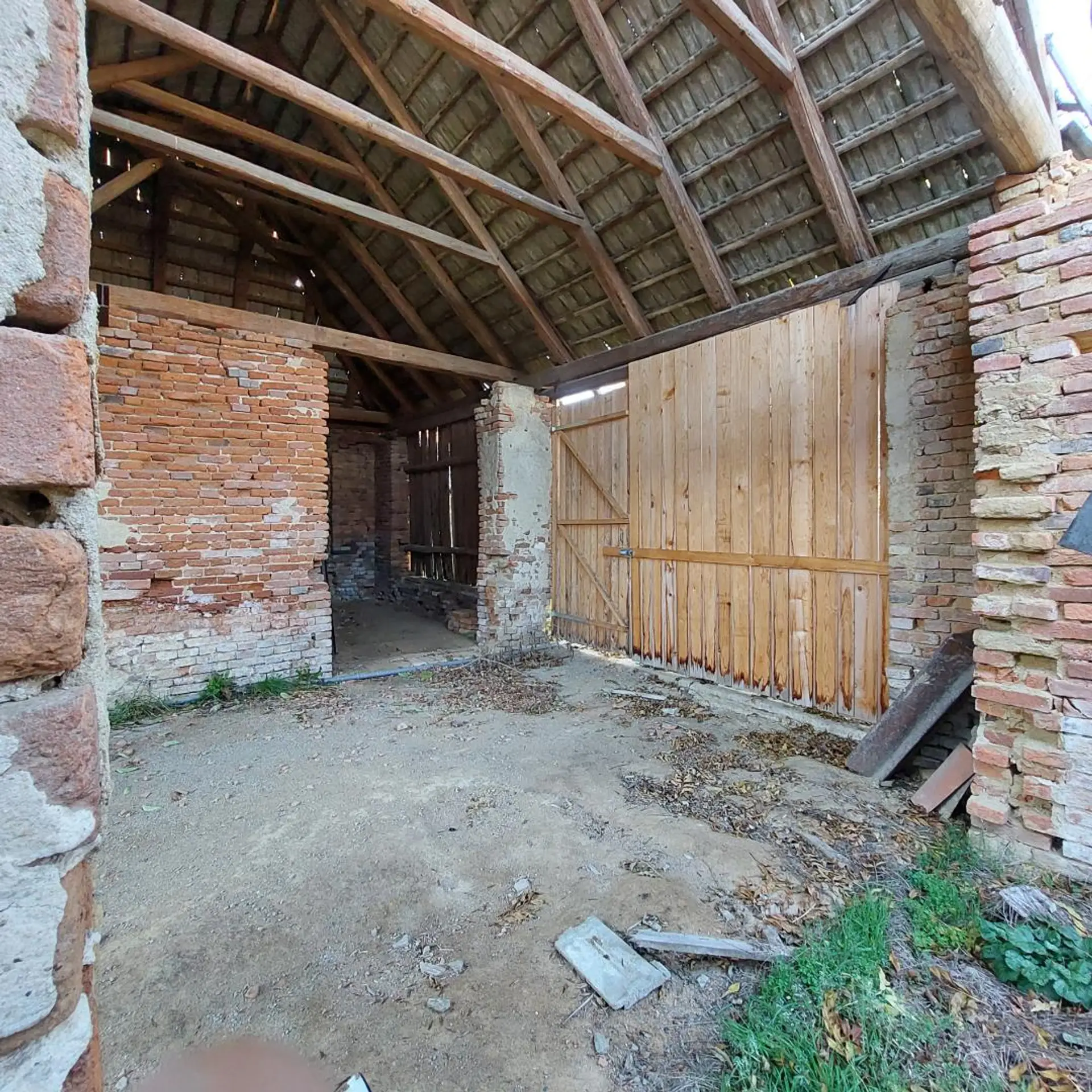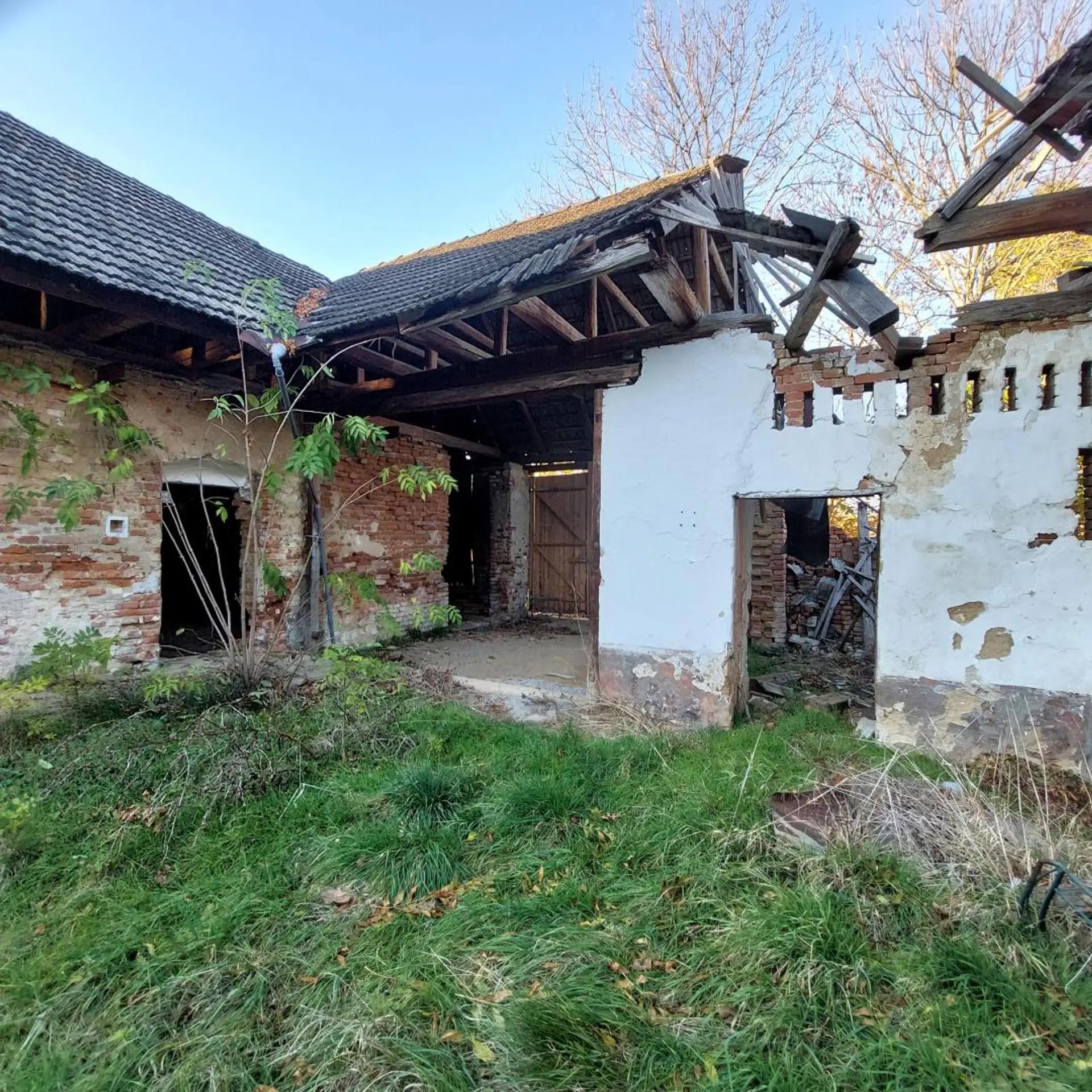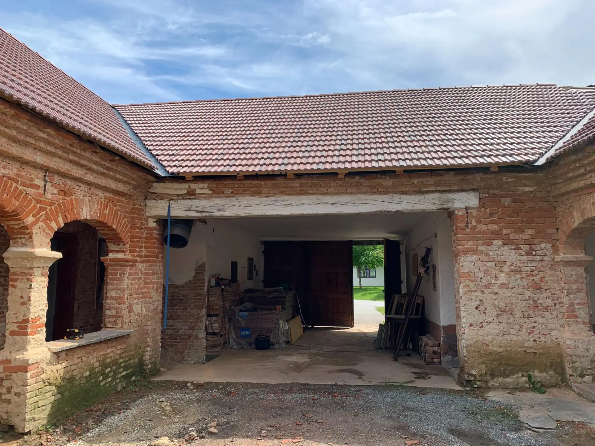 Ein Teil der Wohn- sowie einiger Nutzflächen wurde bereits mit neuen keramischen Dachziegeln eingedeckt. Der Dachstuhl mancher Nebengebäudeteile weist jedoch Schäden auf bzw. ist stellenweise eingestürzt – ein Hinweis auf den Renovierungsbedarf, aber zugleich ein Ansatzpunkt für eine flexible Neugestaltung.