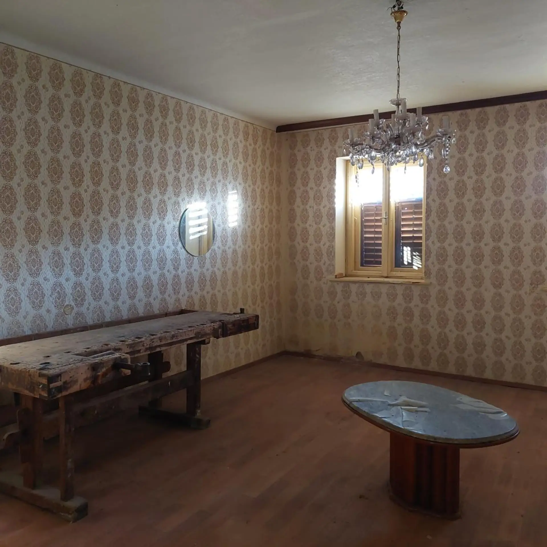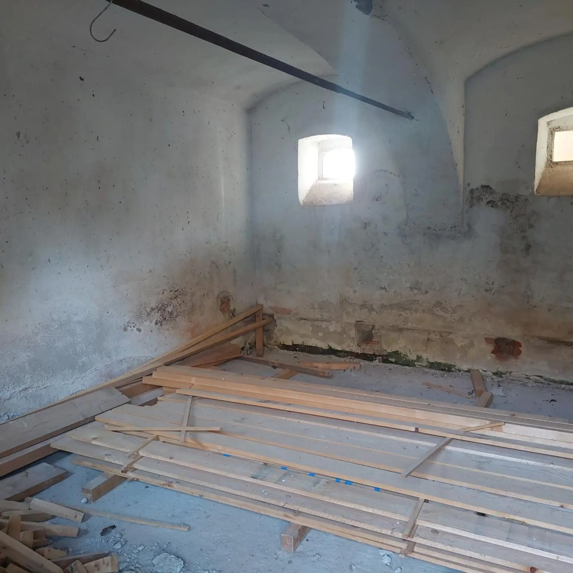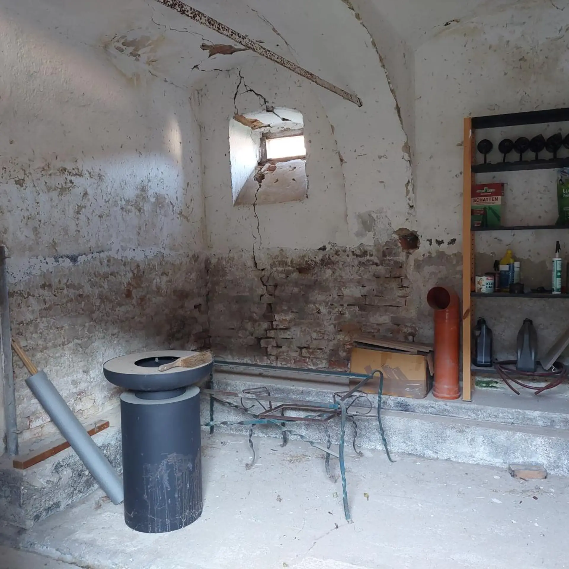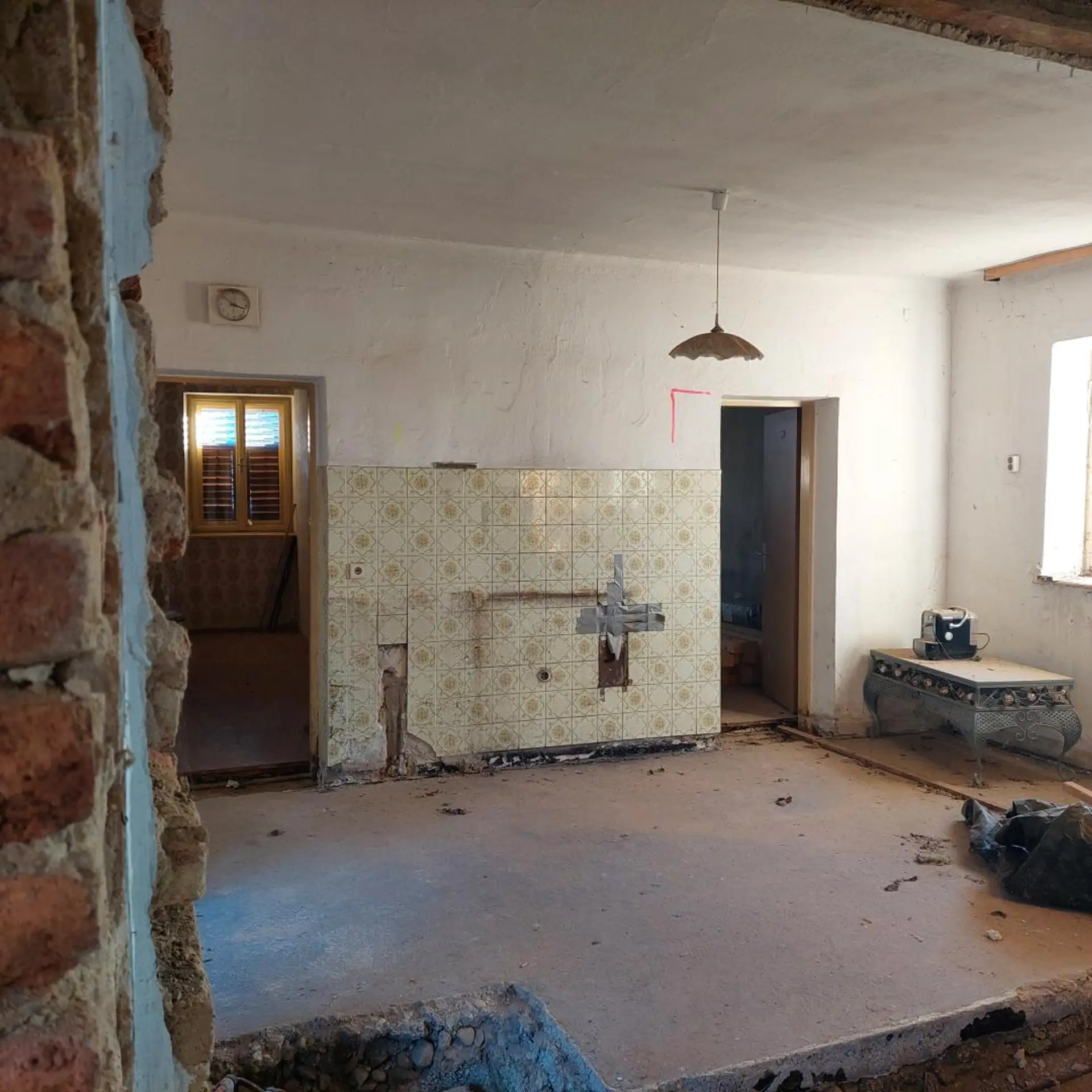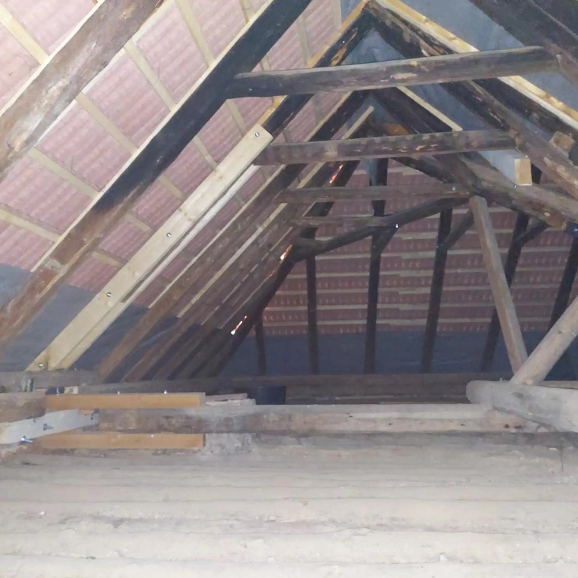 Ein Teil der Wohn- sowie einiger Nutzflächen wurde bereits mit neuen keramischen Dachziegeln eingedeckt. Der Dachstuhl mancher Nebengebäudeteile weist jedoch Schäden auf bzw. ist stellenweise eingestürzt – ein Hinweis auf den Renovierungsbedarf, aber zugleich ein Ansatzpunkt für eine flexible Neugestaltung.