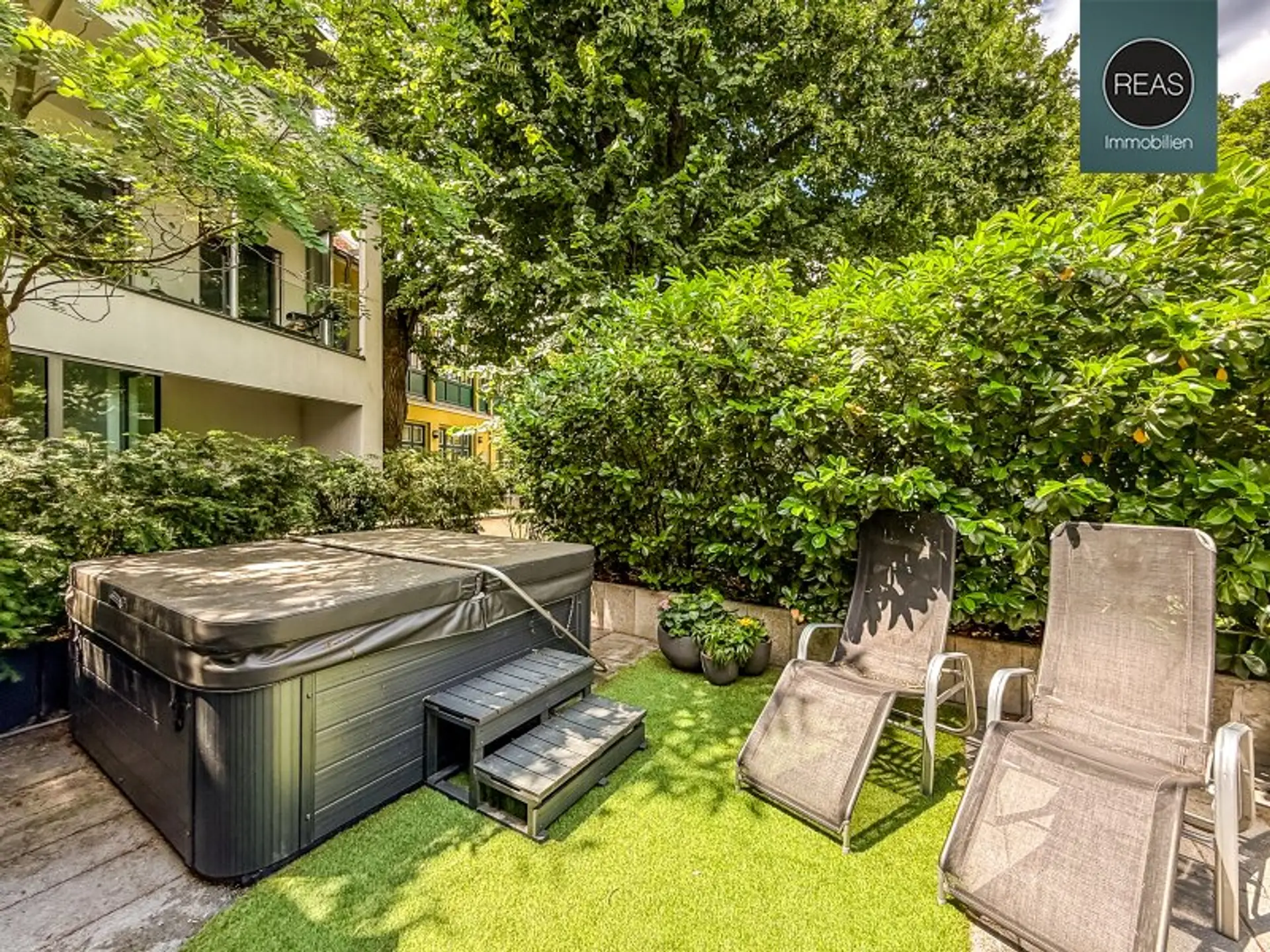 * 1 Garten/Terrasse (Westseite) in herrlicher Grün-Ruhelage im Hof samt Whirlpool/Jacuzzi