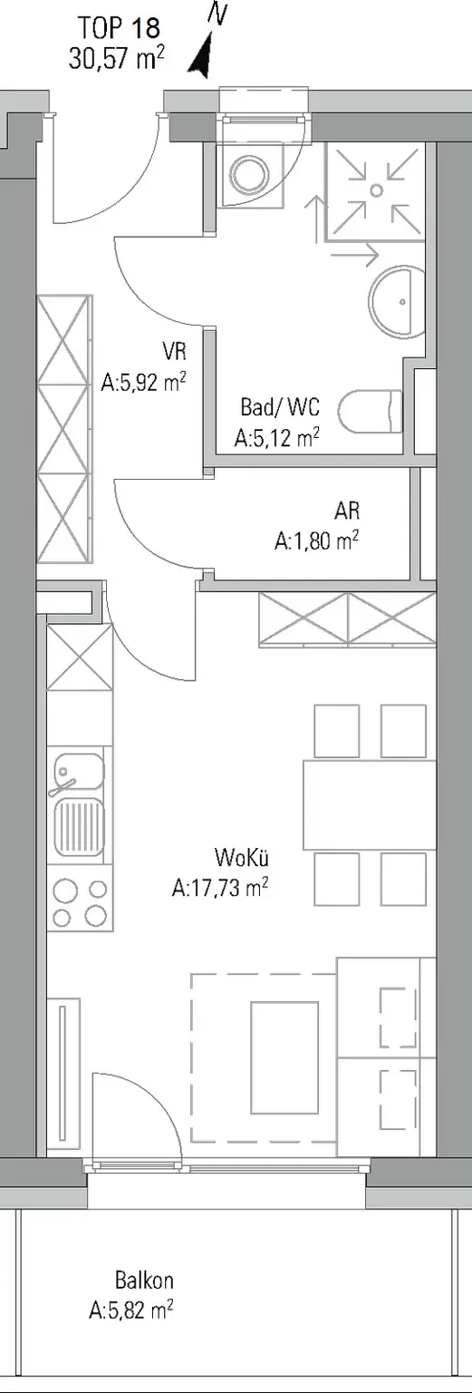 Die Wohnung besteht aus 1 Zimmer: Schlaf- und Wohnzimmer mit Küche. Das Badezimmer ist mit Waschmaschinenanschluss, Dusche und WC und es gibt einen separaten Abstellraum. Der Balkon in Richtung Süden-Westen lädt zum entspannen ein.