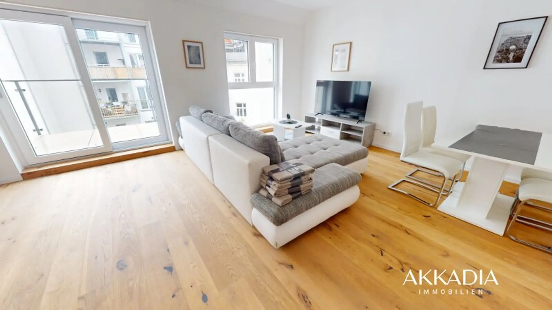 Die Wohnung befindet sich im obersten Liftstock der Liegenschaft. Die Wohnfläche beträgt rund 74 m². Das Wohn- und Esszimmer bietet einen direkten Zugang zum großzügigen Balkon, der Richtung Innenhof gerichtet ist. Darüber hinaus gibt es zwei Schlafzimmer sowie zwei Badezimmer mit WC. Bodentiefe Fenster verleihen den Räumen eine Art Loft-Feeling und eigene Nischen für Einbauschränke runden die smarte Raumaufteilung ab. Außerdem verfügt die Wohnung über eine Fußbodenheizung mit Einzelraumsteuerung sowie über eine Videogegensprechanlage, eine Sicherheitseingangstüre und Alt-Wien-Stil Innentüren. Im gesamten Wohnbereich ist hochwertiger Parkettboden verlegt. Eine Klimaanlage ist vorhanden.