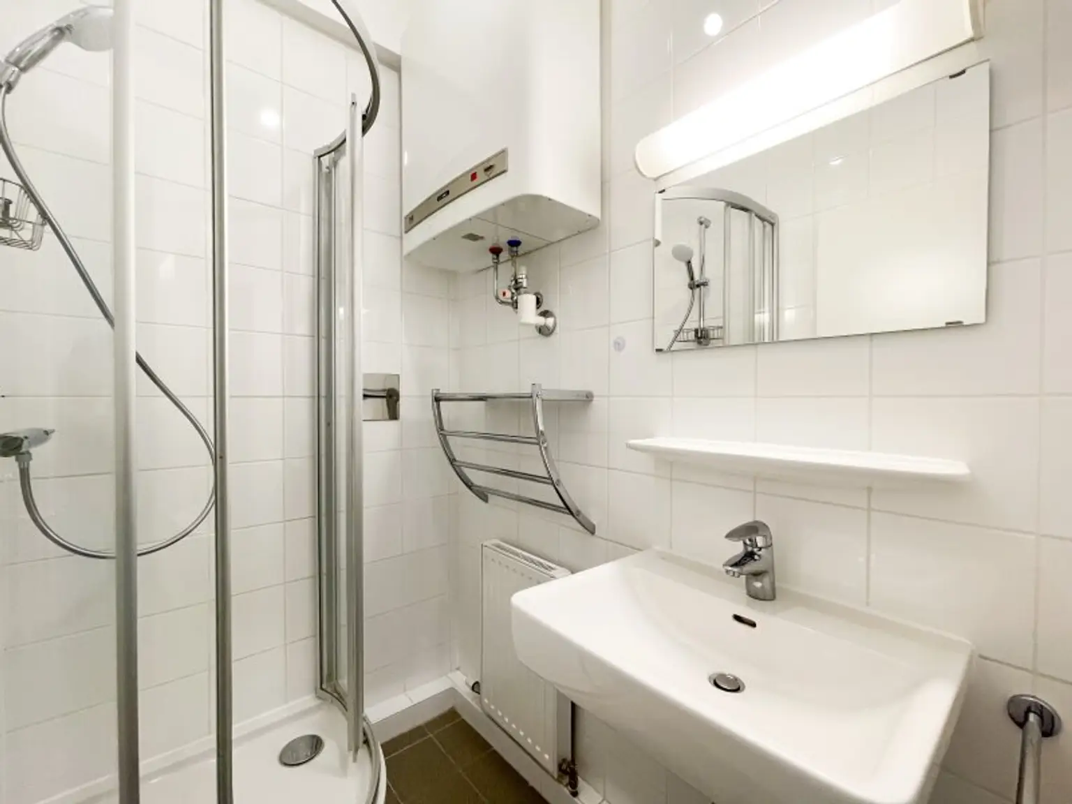 Der Eingangsbereich verfügt über eine Garderobe. Das Badezimmer ist mit Dusche und Waschbecken ausgestattet. Die Toilette ist separat angeordnet.