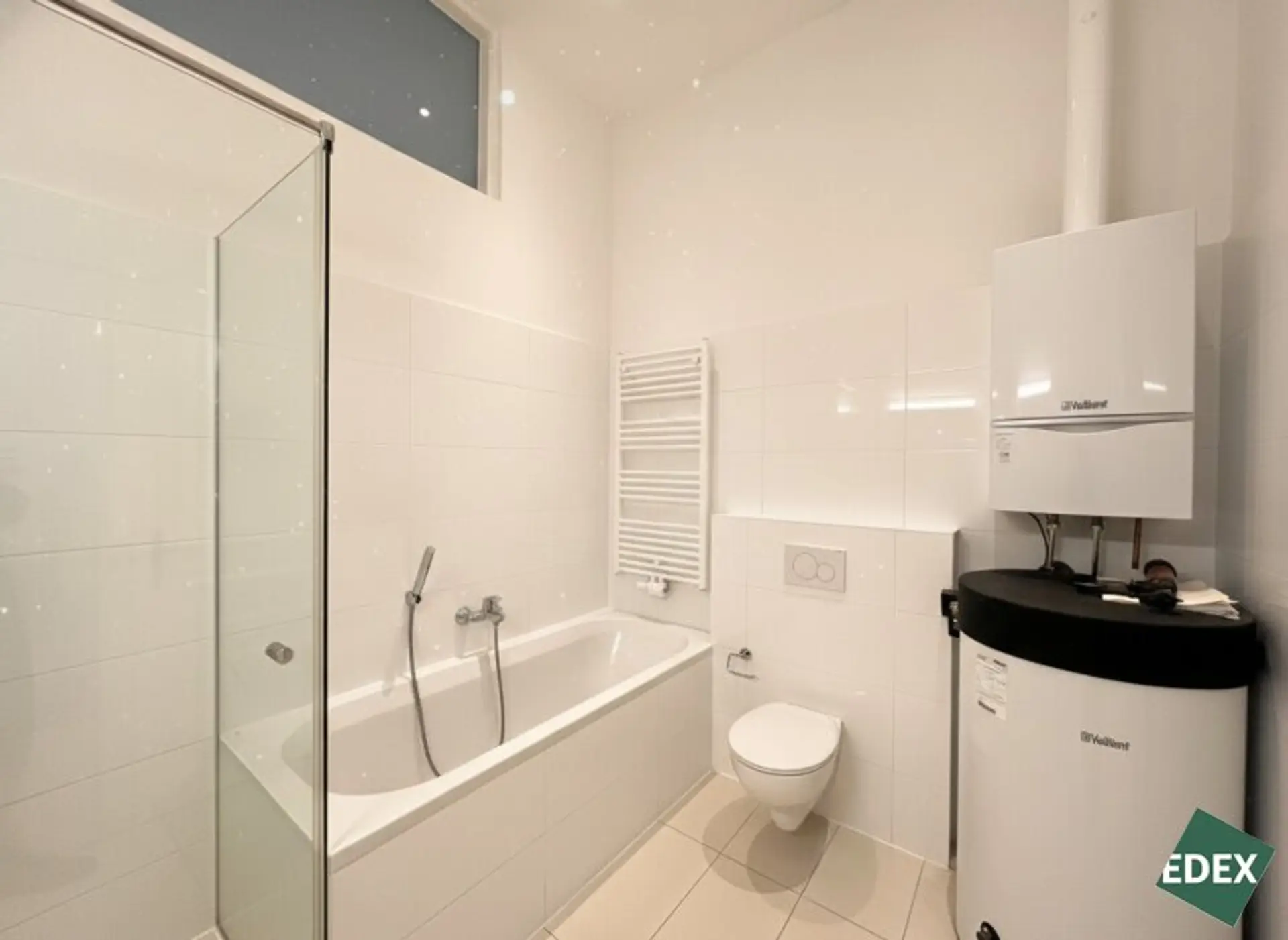 * Badezimmer mit Dusche, Badewanne, Toilette und Waschmaschinenanschluss