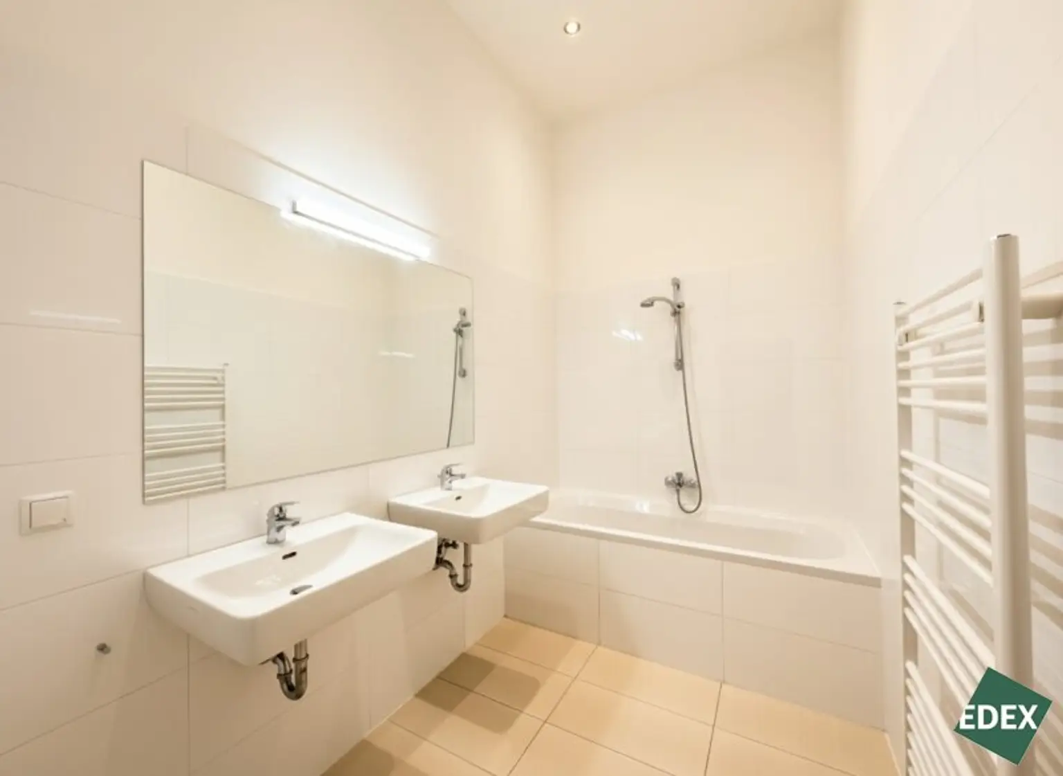* Badezimmer mit Doppelwaschbecken und Badewanne
