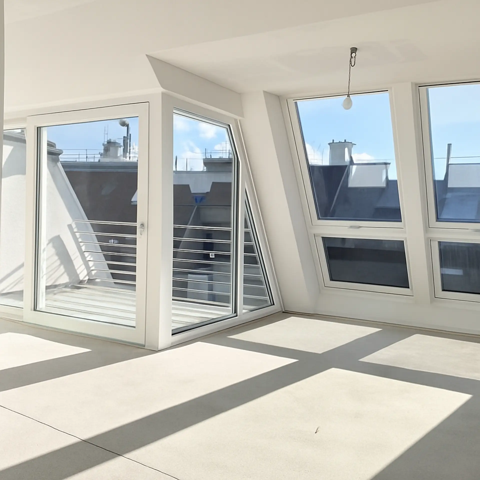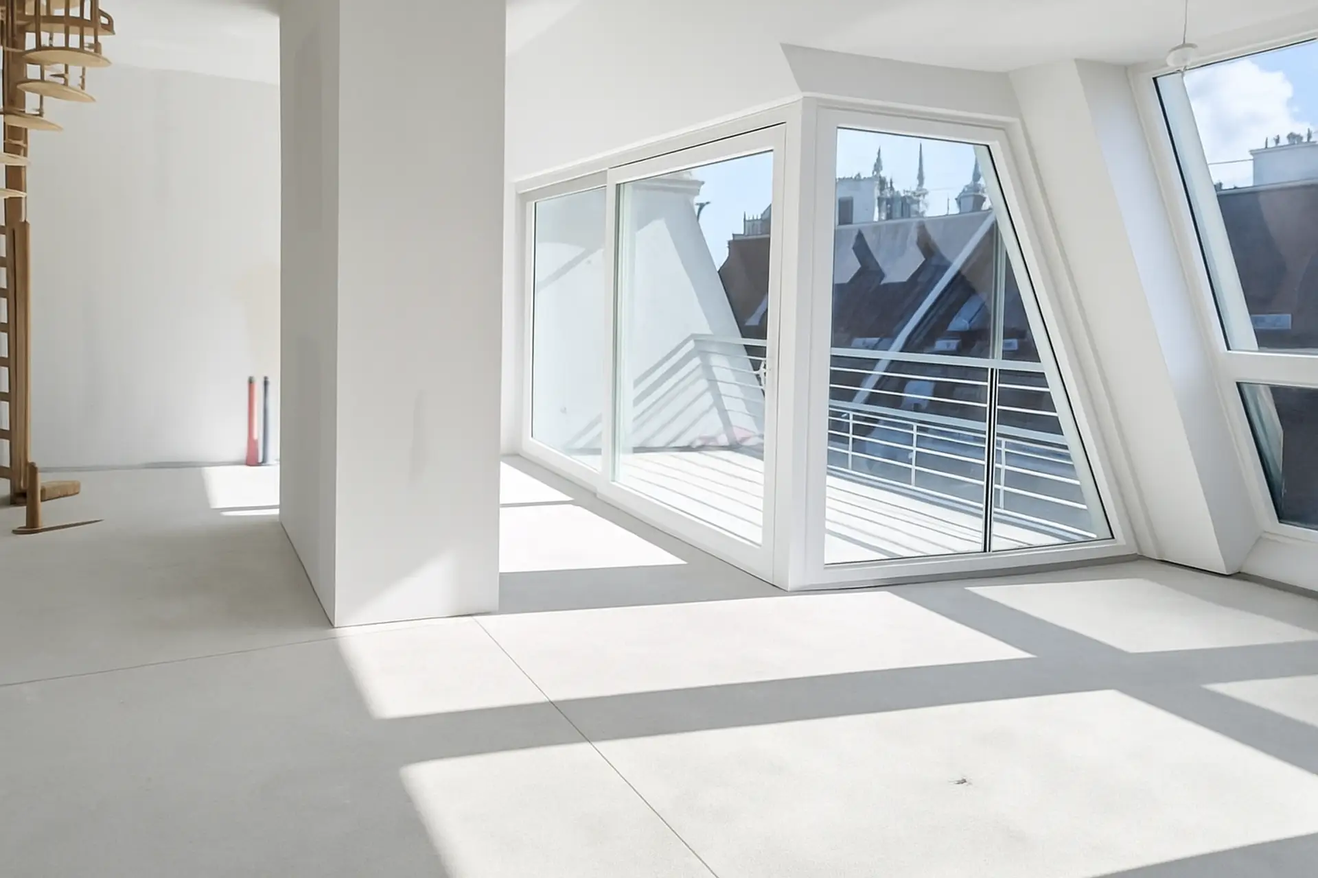 Über das Wohnzimmer gelangt man mittels einer Wendeltreppe auf die über der Wohnung liegenden ca. 34 m² großen Dachterrasse mit traumhaftem 360 Grad Rundblick über die Innenstadt bis zur Steinhofkirche sowie Kahlenberg und Leopoldsberg..