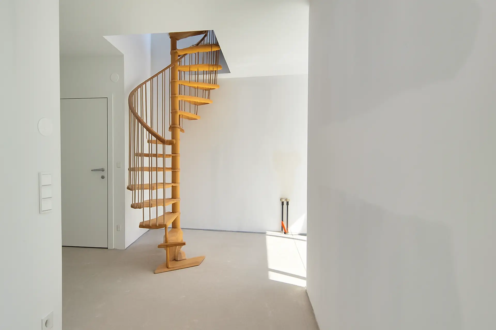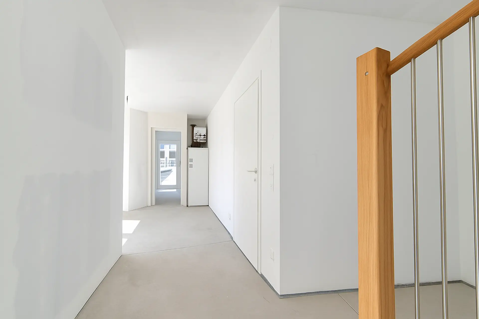 Man betritt sie über einen großzügigen Eingangsbereich, von dem aus das WC und die Treppe auf die Dachterrasse zugänglich sind und der in den fast 42 m² großen lichtdurchfluteten Wohnbereich mit offener Küche übergeht.