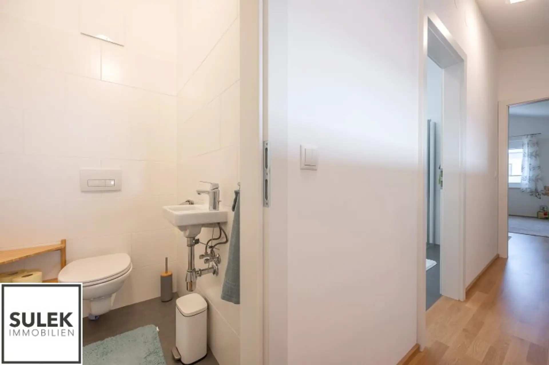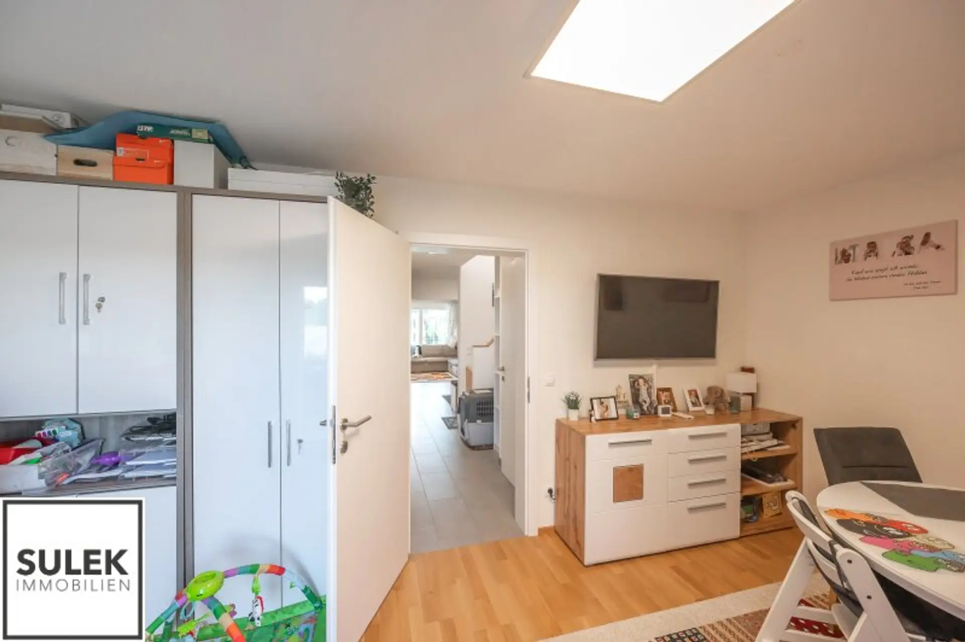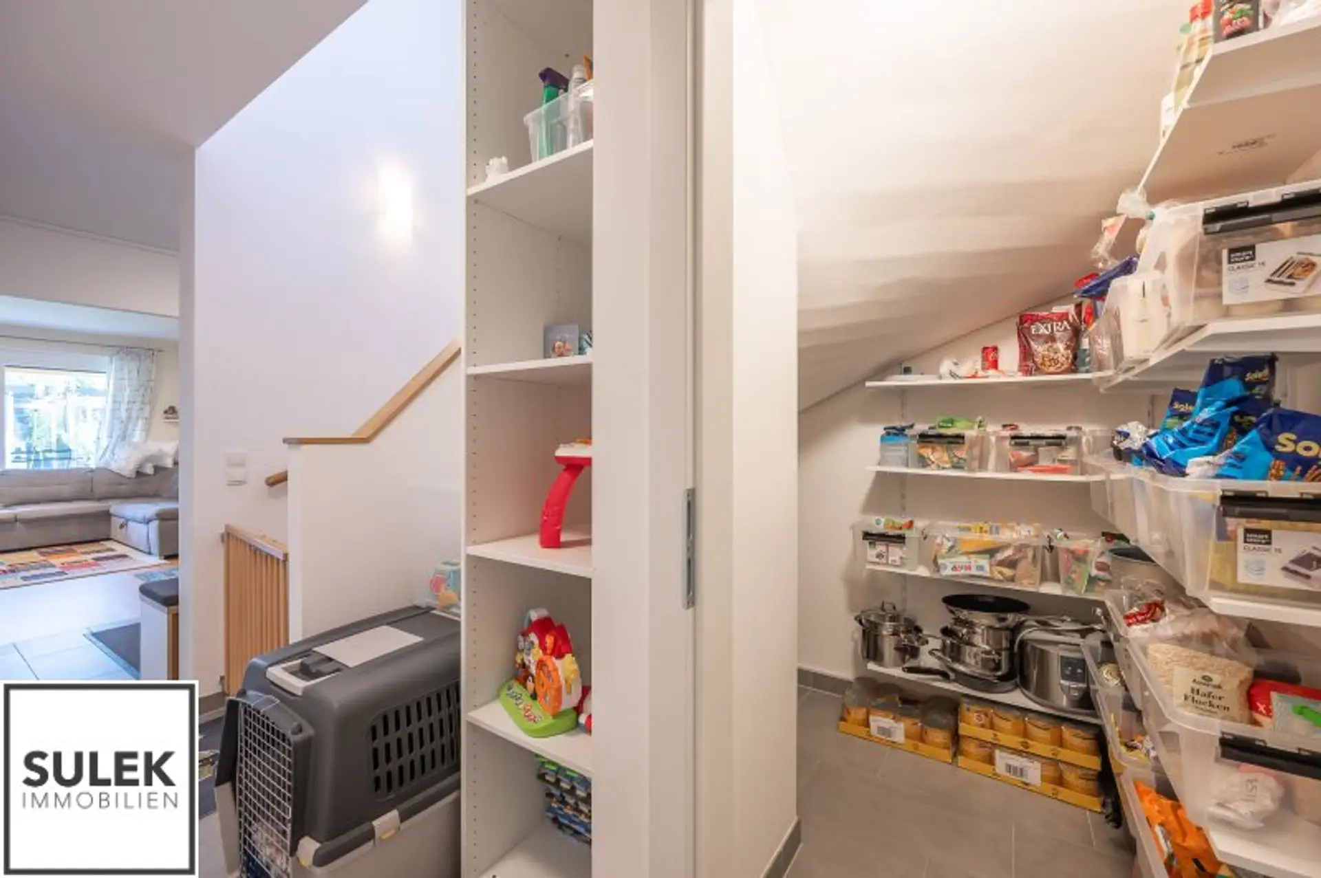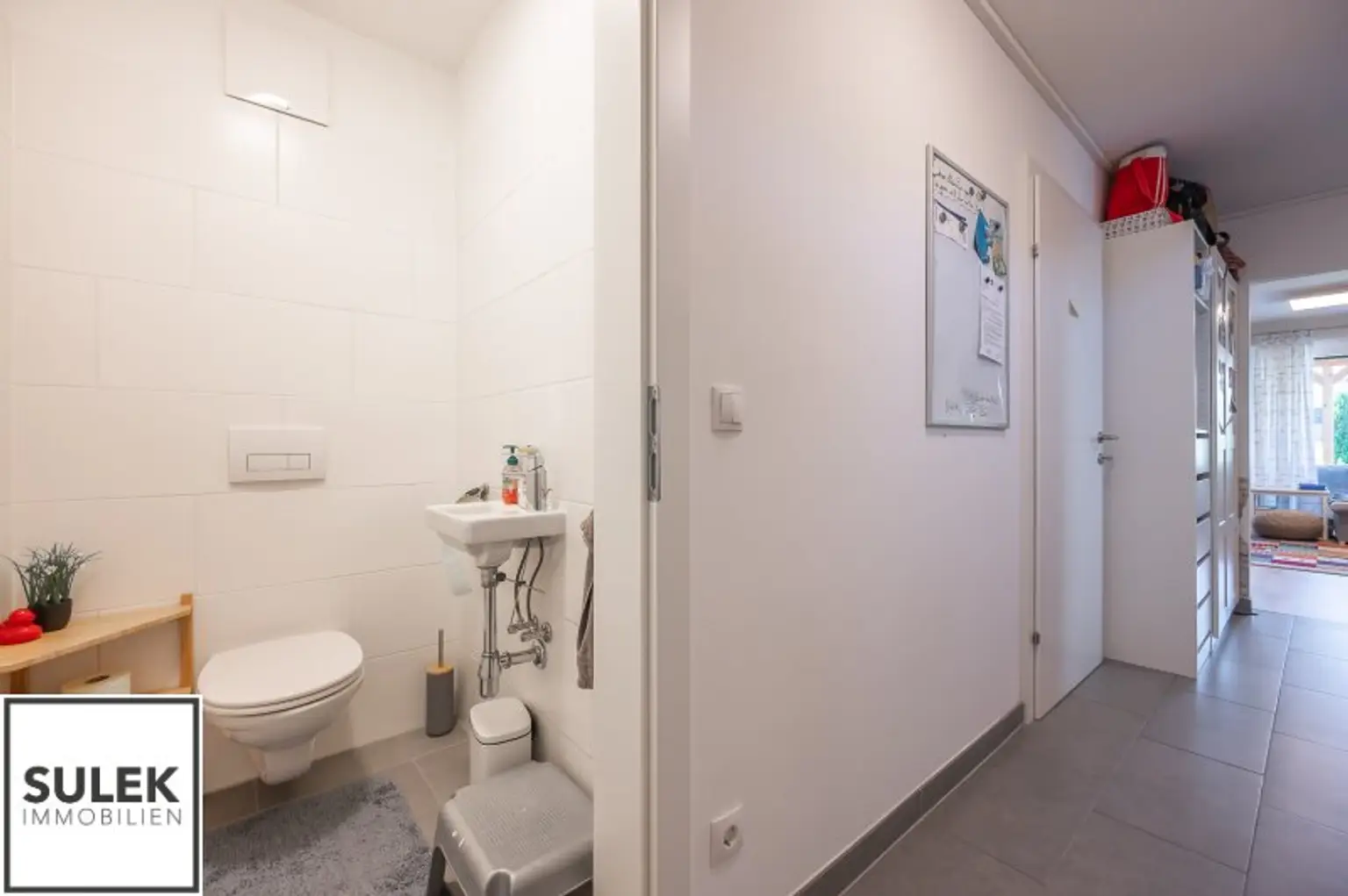 Links des Zugangs befindet sich der nette Vorgarten. Seitlich befindet sich ein Car-Port, sowie Platz für ein 2. Auto. Der Hauseingang befindet sich ebenfalls seitlich. Im Erdgeschoss befindet sich ein zentraler Vorraum. Linker Hand ist aktuell das Esszimmer eingerichtet - dieses kann alternativ auch als Schlafzimmer genutzt werden. Rechter Hand befindet sich der Wohnbereich mit einer voll ausgestatteten DAN-Küche, die auch im Objekt verbleibt. Der Wohnbereich bietet auch Zugang zur Terrasse und dem kleinen Eigengarten. Ebenfalls im Erdgeschoss befindet sich eine Toilette und der Technikraum im dem neben zusätzlichem Stauraum auch der WM-Anschluss ist.