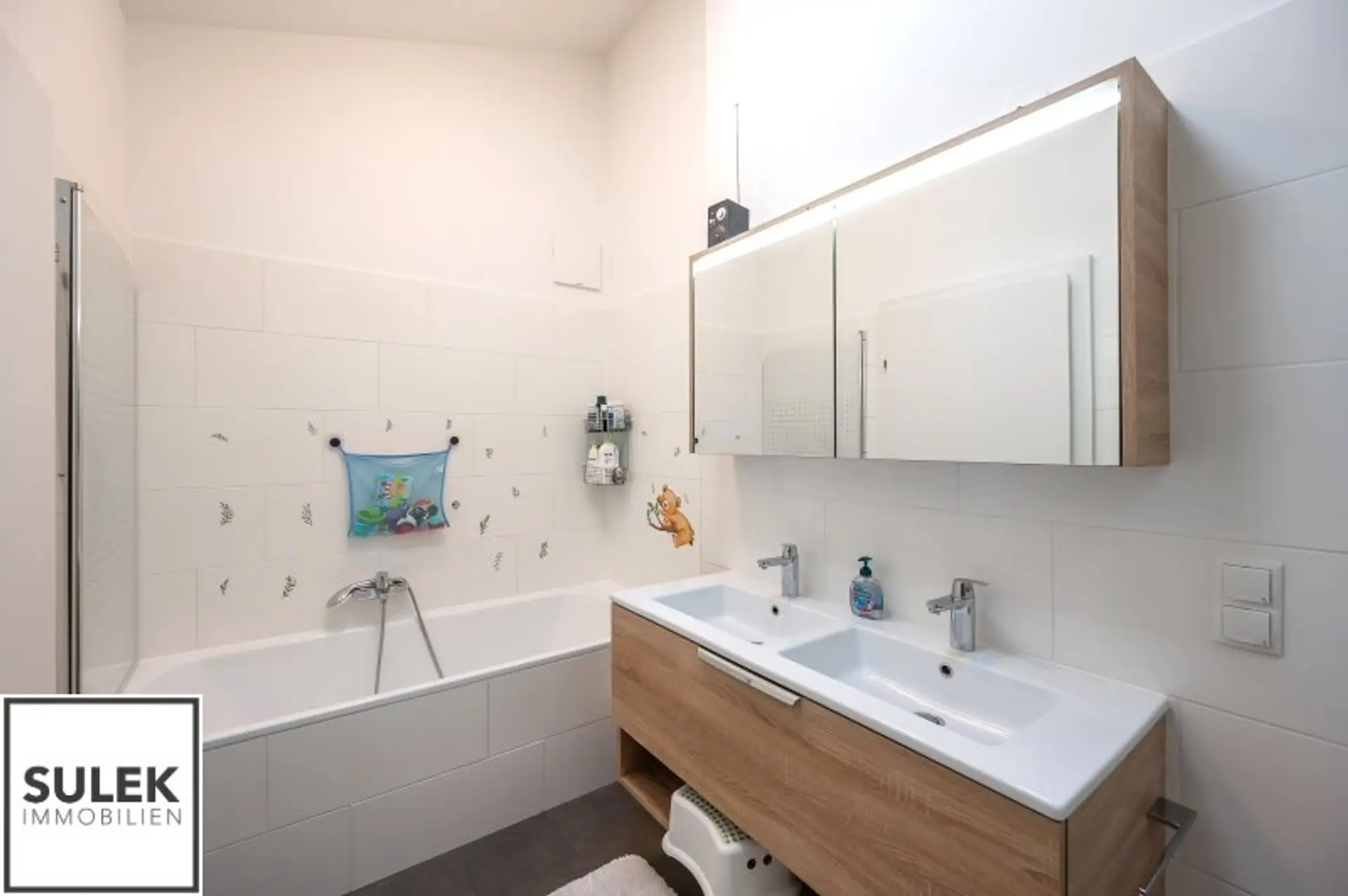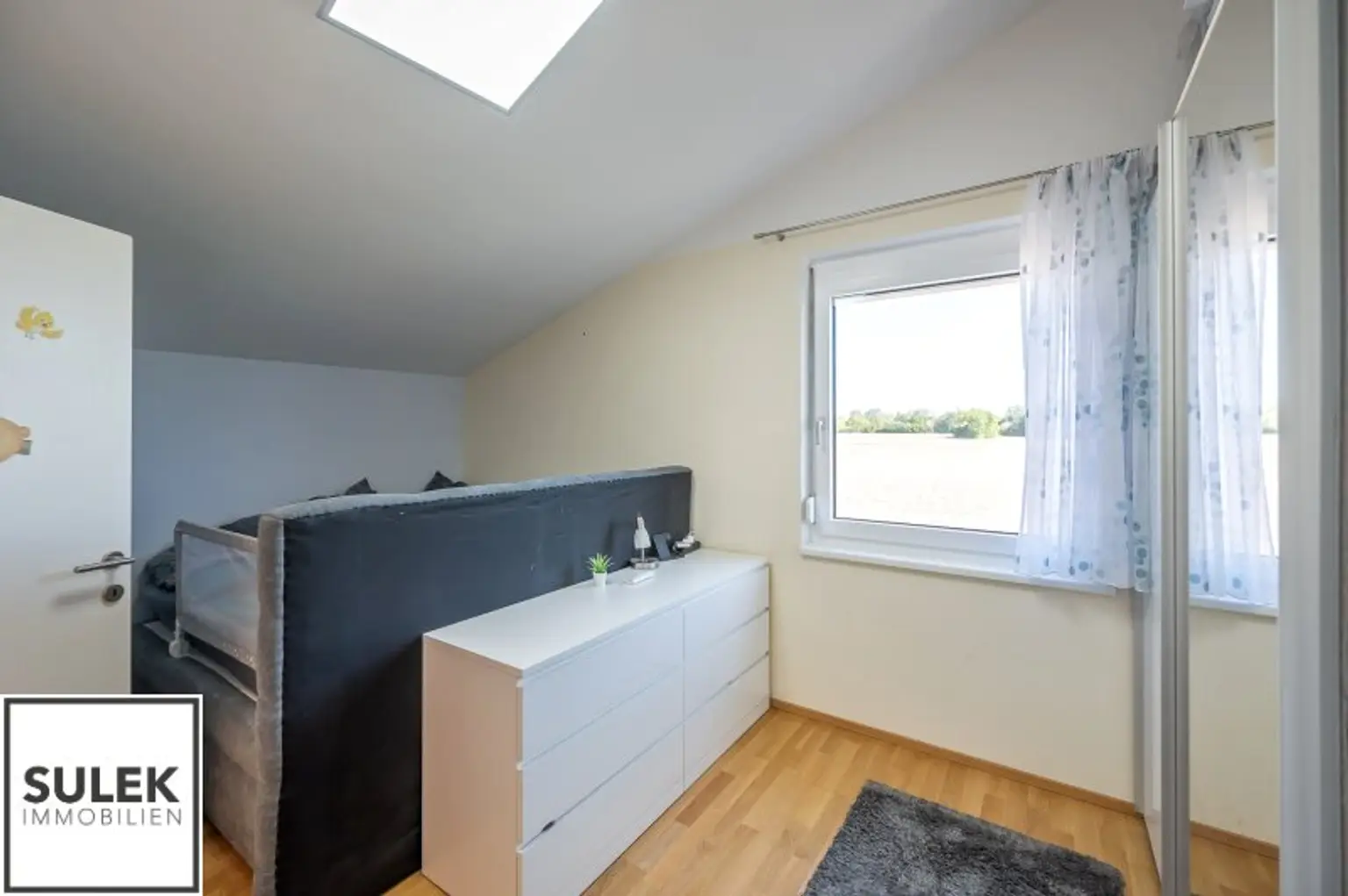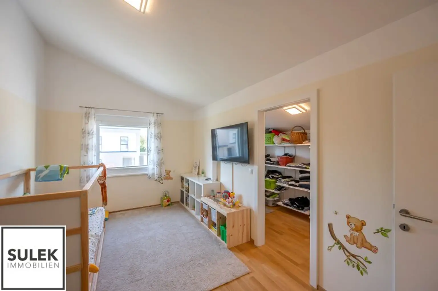 Im Obergeschoss befinden sich aktuell 2 Schlafzimmer, eines davon mit begehbarem Kleiderschrank, sowie ein Badezimmer mit Dusche und Wanne, Doppelwaschbecken und sowie einer weiteren Toilette. Die aktuellen Eigentümer haben bereits beim Kauf auf Details geachtet und z.B. ein Fenster im Badezimmer einbauen lassen.