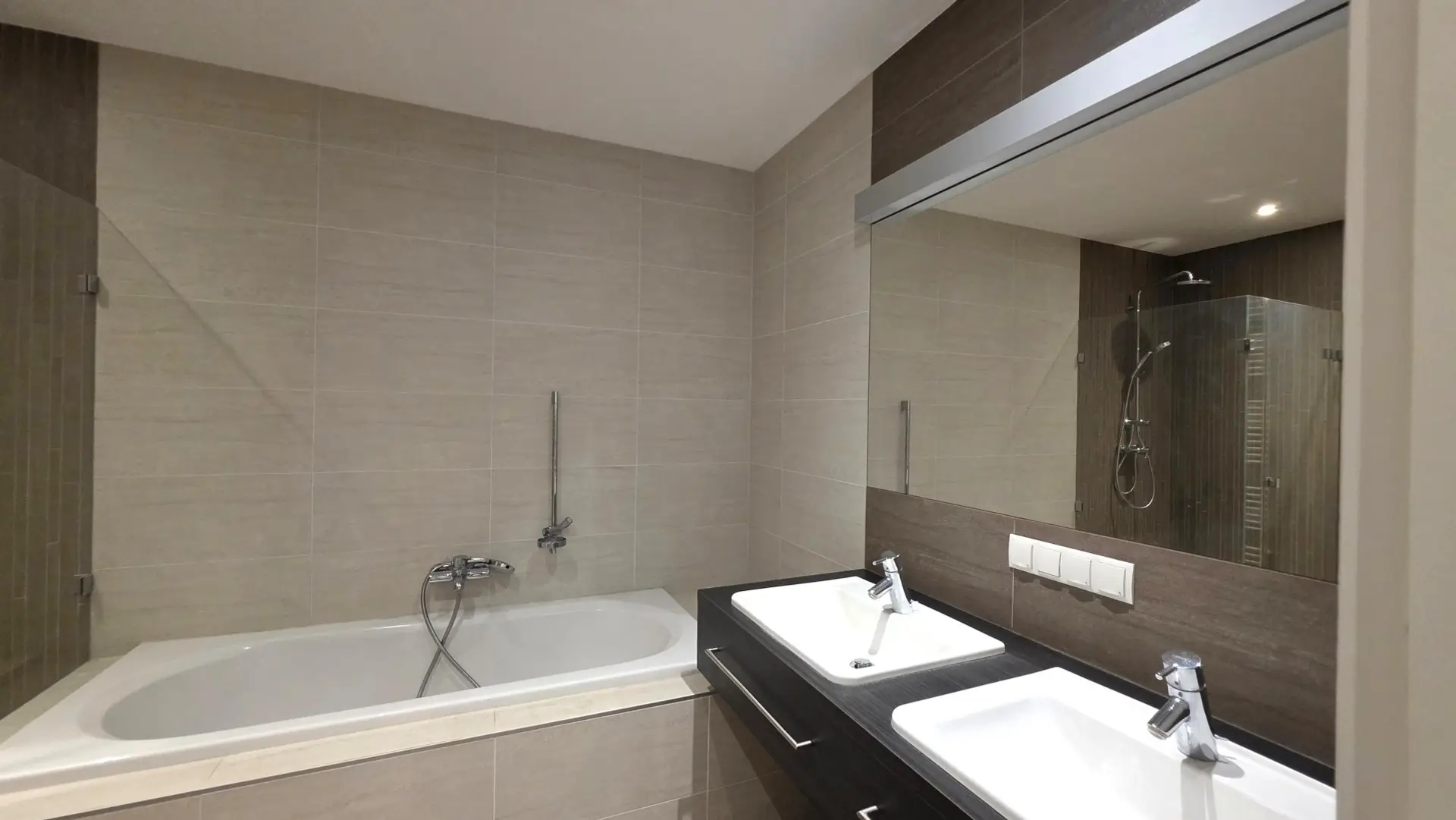 • Badezimmer mit Badewanne, Dusche, Doppelwaschbecken und WC