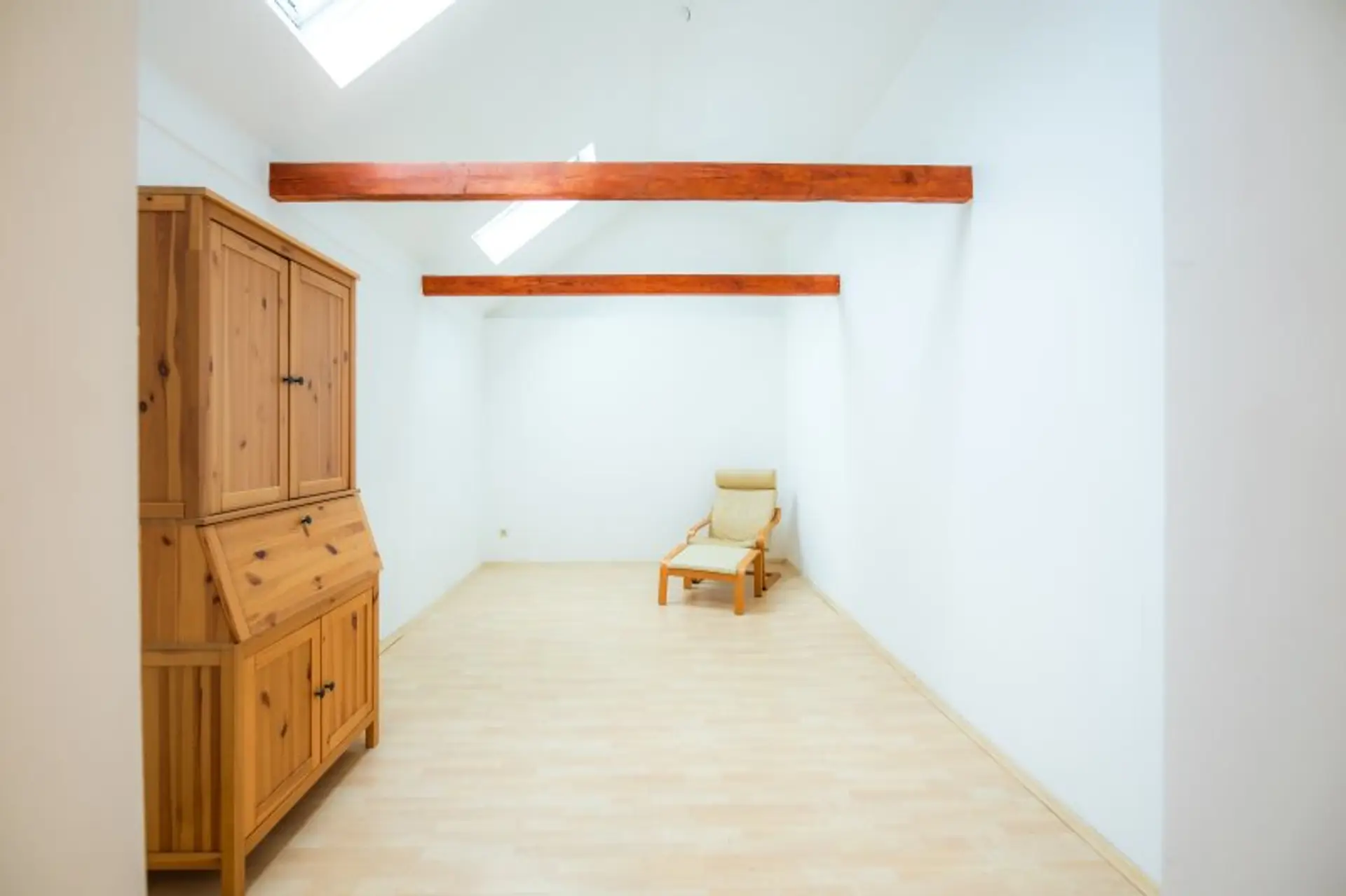 Über eine Treppe erreichen Sie das Obergeschoss mit einem großzügigeren (Eltern)schlafraum mit angrenzendem Schrankraum. Auch auf dieser Ebene finden Sie ein Bad und ein separates WC vor. Das Badezimmer ist mit einer Badewanne und einer Dusche ausgestattet und verfügt über ein Fenster, das für natürliche Lichtverhältnisse sorgt.