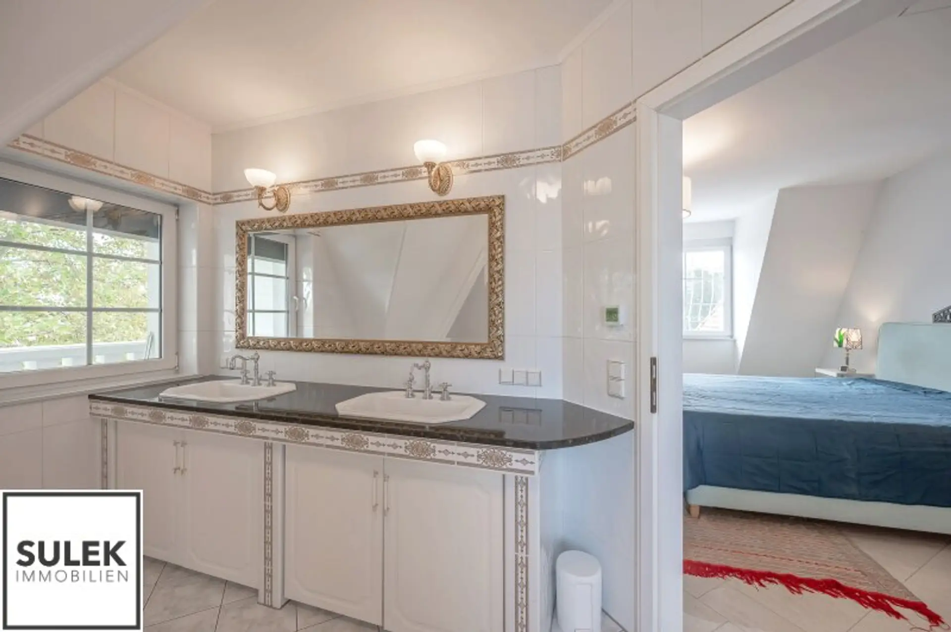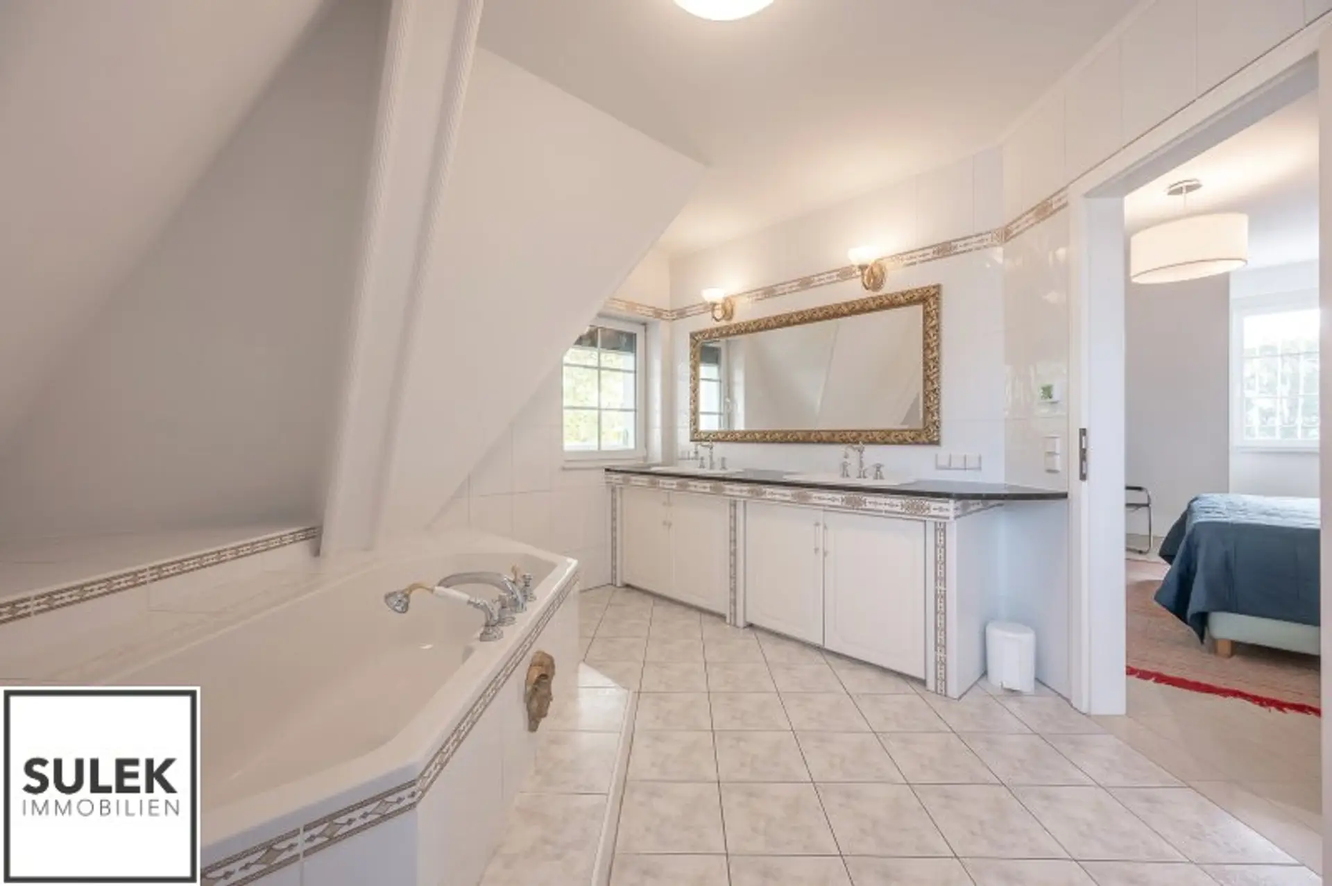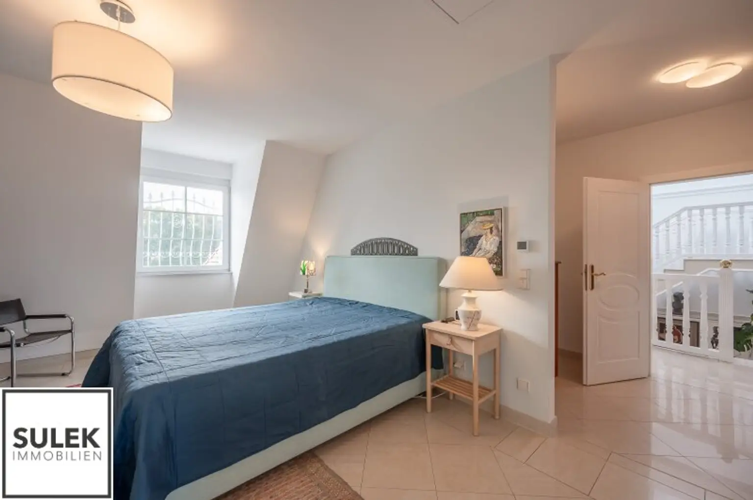 Der erste Stock bildet den privaten Schlafbereich. Hier befindet sich der Masterbedroom mit ensuite Badezimmer mit Dusche, Badewanne, WC und Doppelwaschbecken. Außerdem gibt es einen weiteren Schlaftrakt mit zwei Zimmern und geteiltem Badezimmer – ebenfalls mit Dusche, Wanne, WC und Doppelwaschbecken. Ein zusätzliches Zimmer, zuletzt als Büro genutzt, kann ebenfalls als weiteres Schlafzimmer dienen. Eine sehr großzügige Garderobe im Halbstock darüber rundet diesen Bereich ab.
