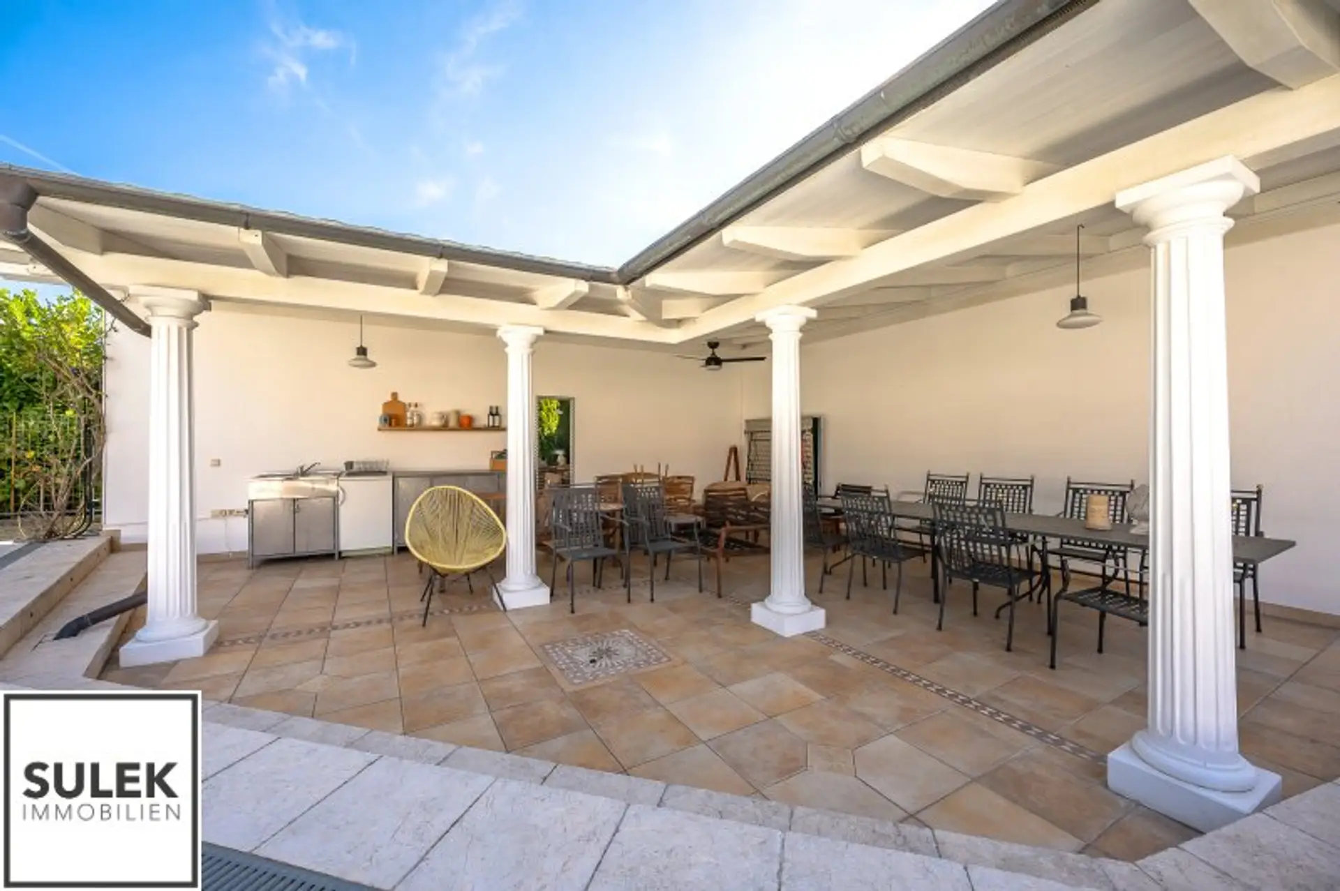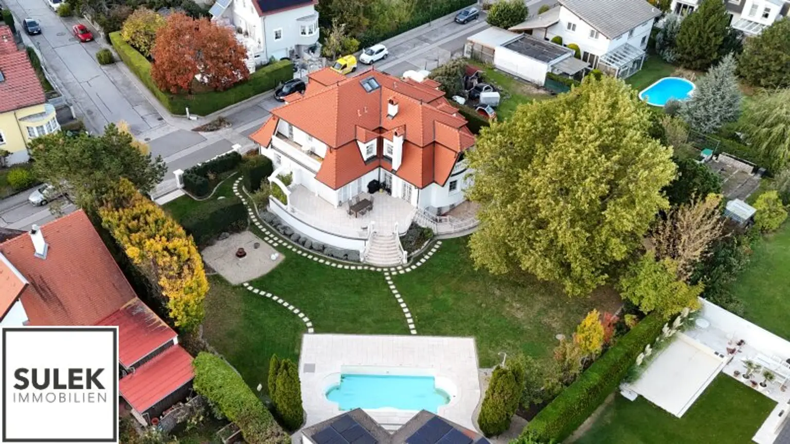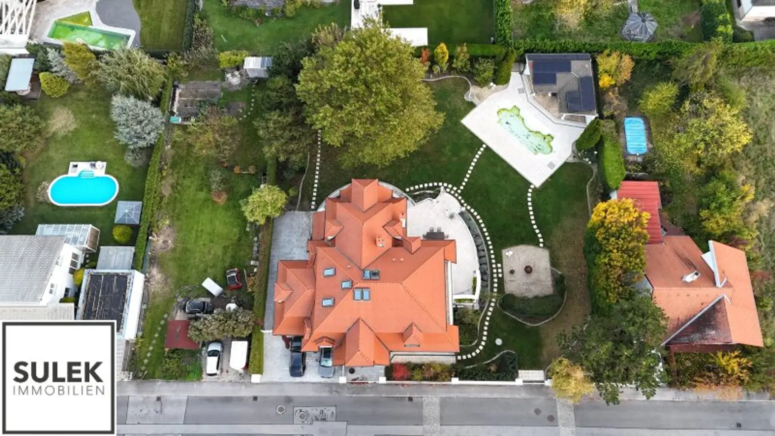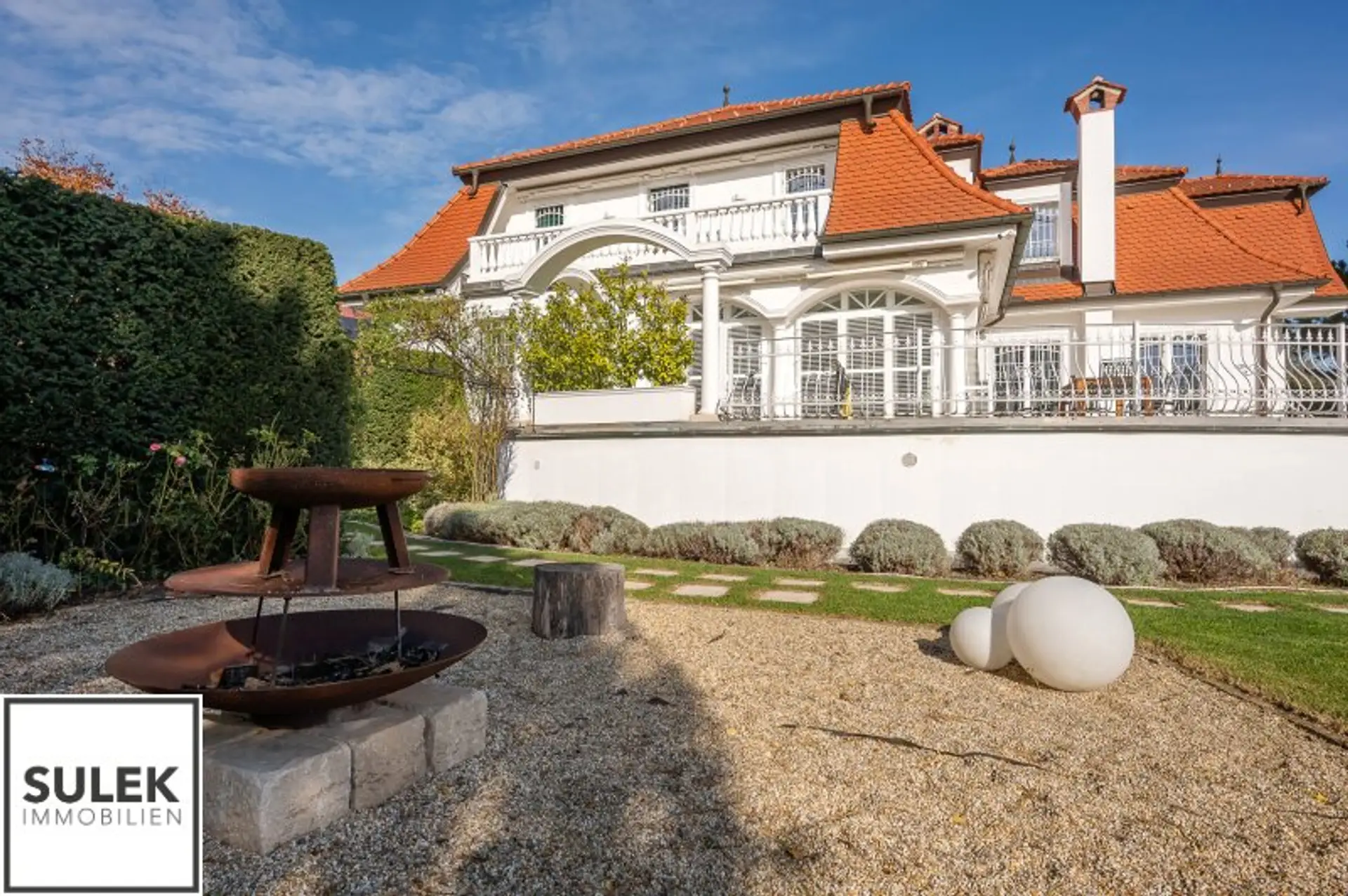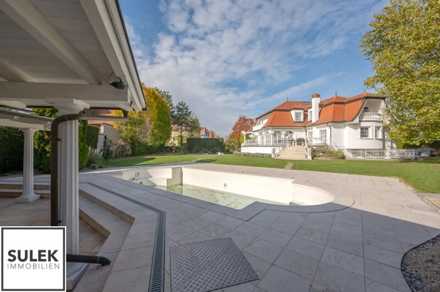 Der Garten ist ein echtes Highlight: Von Wintergarten und Wohnsalon aus betreten Sie die weitläufige Terrasse mit traumhaftem Blick in den Garten mit altem Baumbestand. Hier findet sich eine parkähnlich ausgeführte und gepflegte Begrünung. Der große Pool mit eigener Poolterrasse, Outdoor-Küche und zahlreichen überdachten Sitzgelegenheiten, schafft ein privates Urlaubsambiente. Eine charmante Feuerstelle rundet das Freizeitangebot ab.