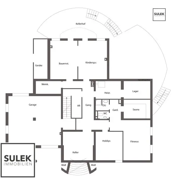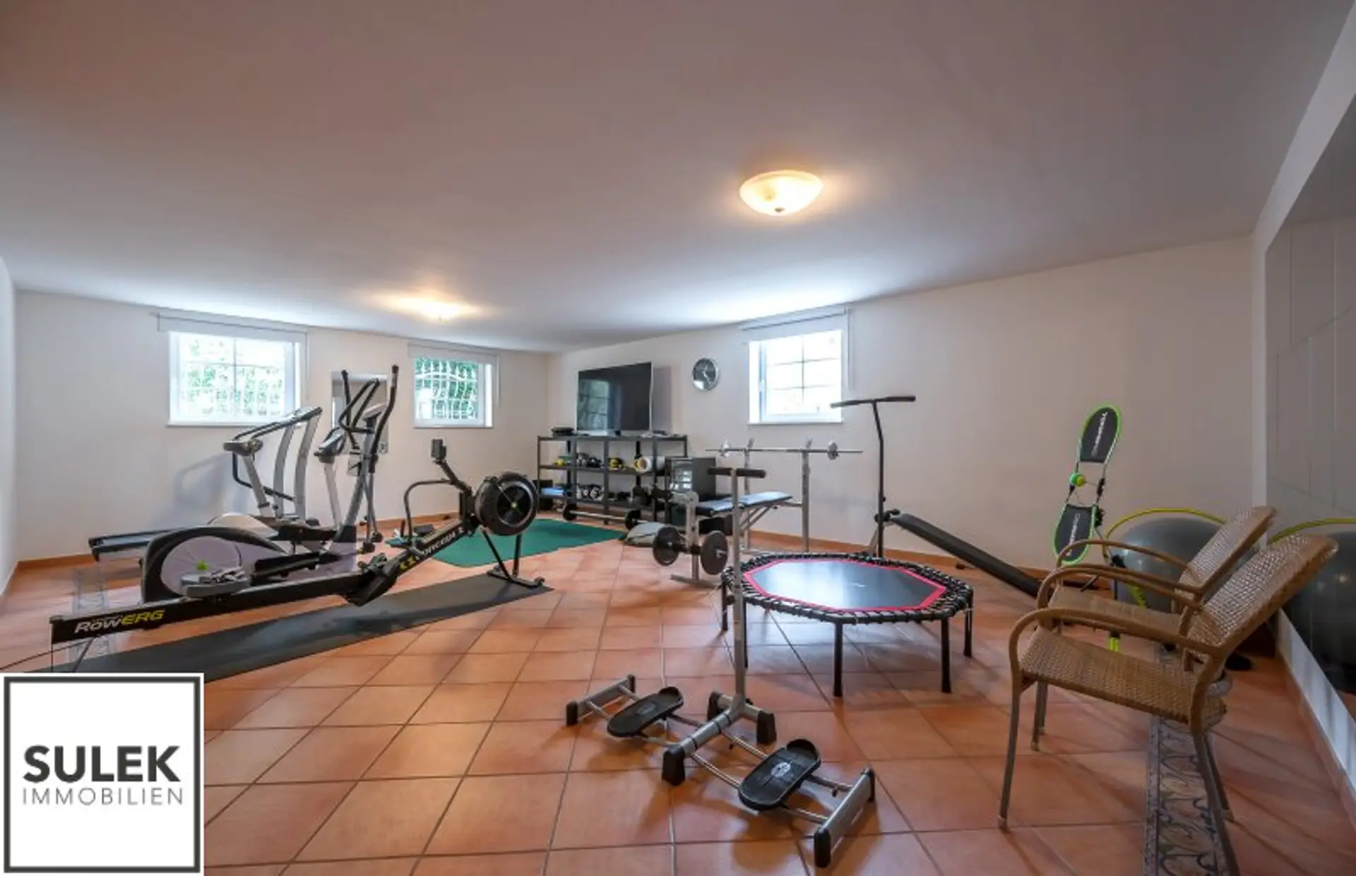 Im Kellergeschoss finden Sie stirnseitig den großzügigen Fitness- und Wellnessbereich mit eigener Sauna, Badezimmer mit Dusche und separater Toilette. Links befindet sich ein weitläufiger Vorraum, der in ein großes Zimmer führt – ideal als Hobbyraum oder zusätzliches Schlafzimmer, mit direktem Zugang zum Garten. Dieser Raum kann im Bedarfsfall auch in 2 Zimmer geteilt werden. Ergänzt wird dieser Bereich durch einen Technikraum, einen Lagerraum sowie einen weiteren Abstellraum, der zuletzt als Weinkeller genutzt wurde.