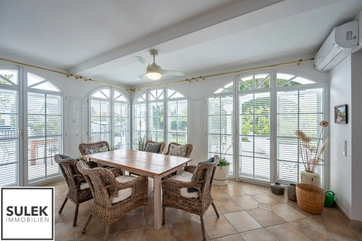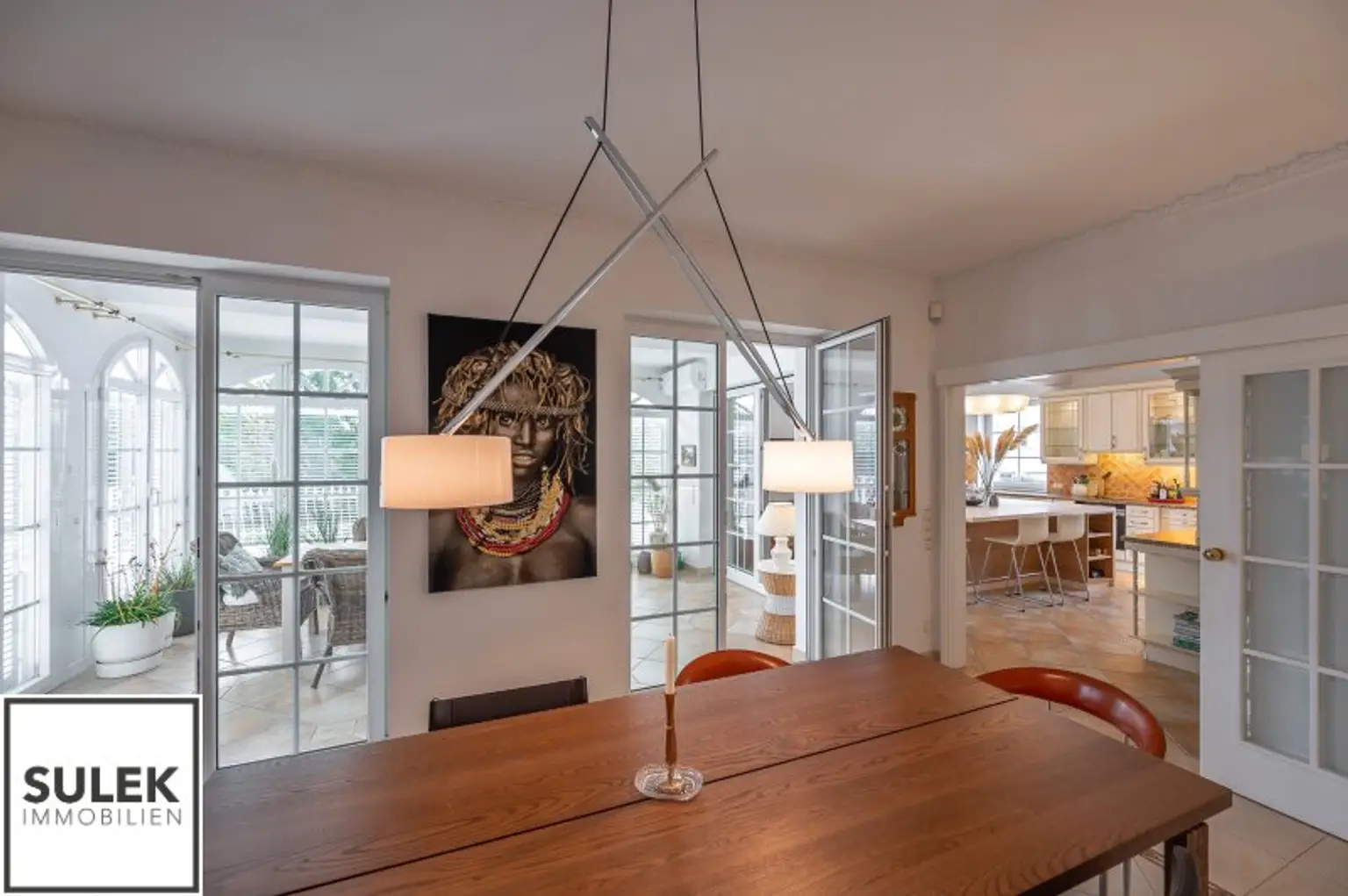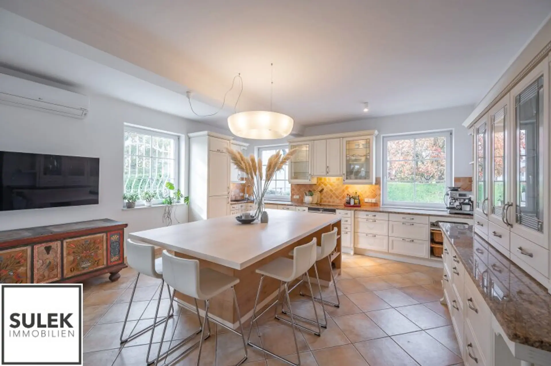 Rechter Hand liegt die große, offen gestaltete Country-Küche mit eigener Speisekammer samt Schmutzküche. Angrenzend befindet sich das charmante Esszimmer, sowie ein vollverglaster Wintergarten mit zusätzlichem Essbereich – ideal, um zu jeder Jahreszeit den Blick ins Grüne zu genießen. Ebenfalls von der Eingangshalle aus erreichbar ist der großzügig dimensionierte Wohnsalon mit Blick in den Garten und mit direktem Zugang zur Terrasse.