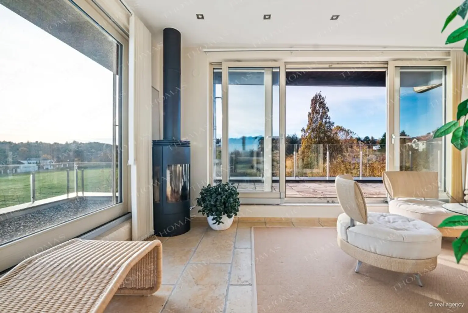 Der offene Wohn- und Essbereich mit stilvoller Galerie und Kamin bildet das Herzstück der Villa. Die gesamte Fensterfront lässt sich zur Terrasse hin öffnen und verbindet den Innenraum fließend mit dem weitläufigen Garten sowie dem 8 x 4 m großen Schwimmbad direkt vor dem Haus – ein perfekter Ort für stilvolle Entspannung und Privatsphäre inmitten der Natur.