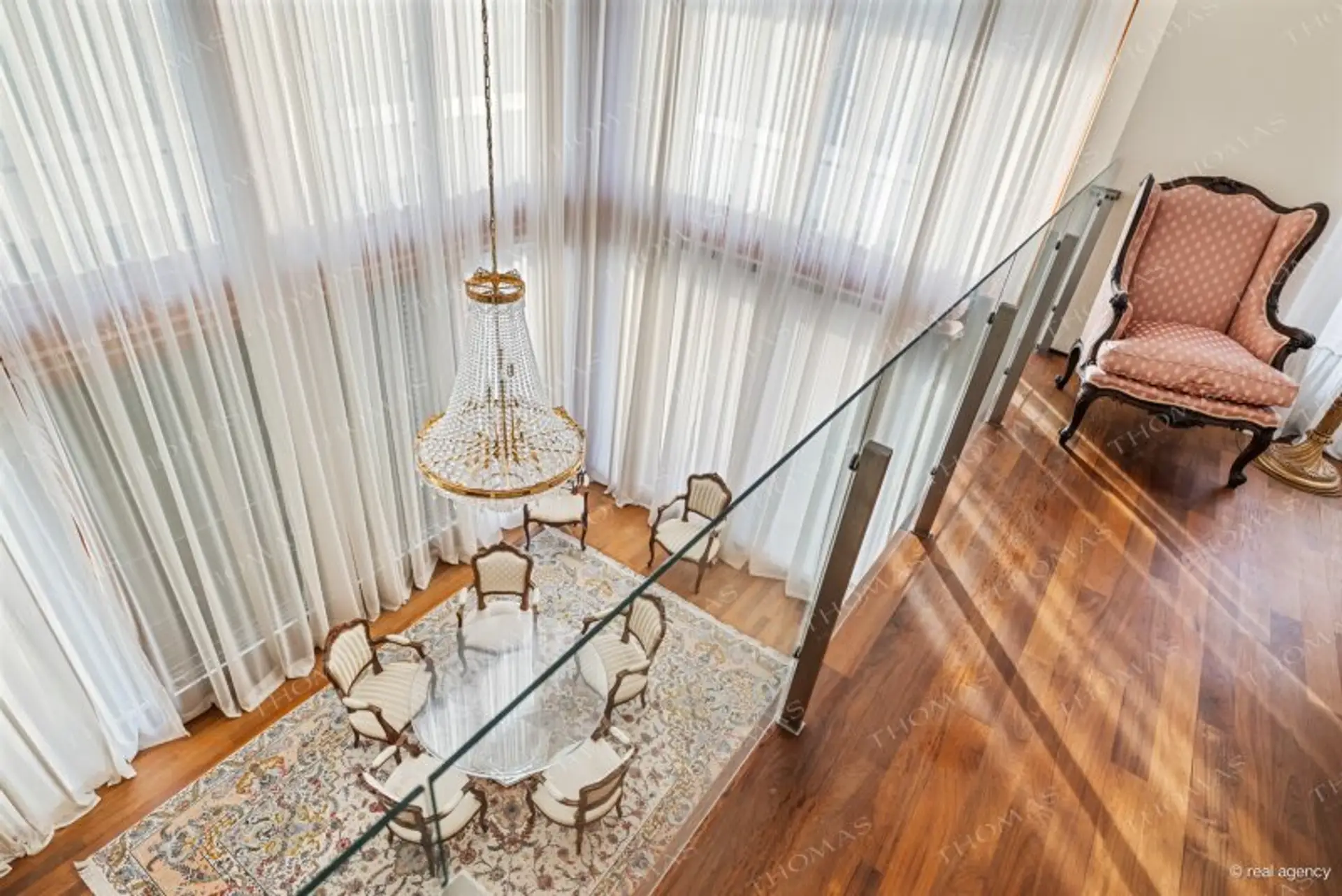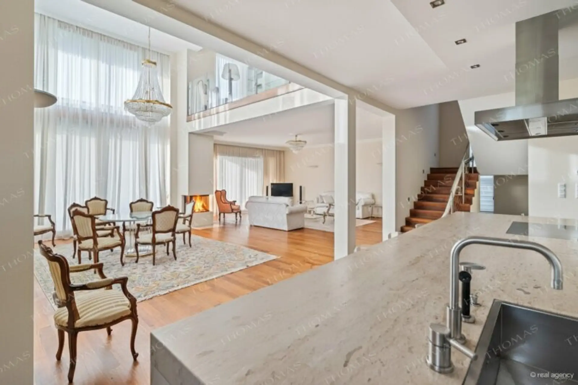 Lichtdurchfluteter Wohn- und Essbereich mit stilvoller Galerie und Kamin