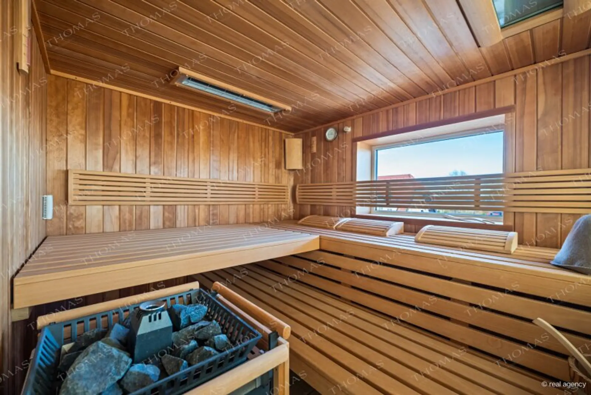 Wellness area with sauna, steam bath, whirlpool, and fireplace, surrounded by generous outdoor spaces with breathtaking panoramic views