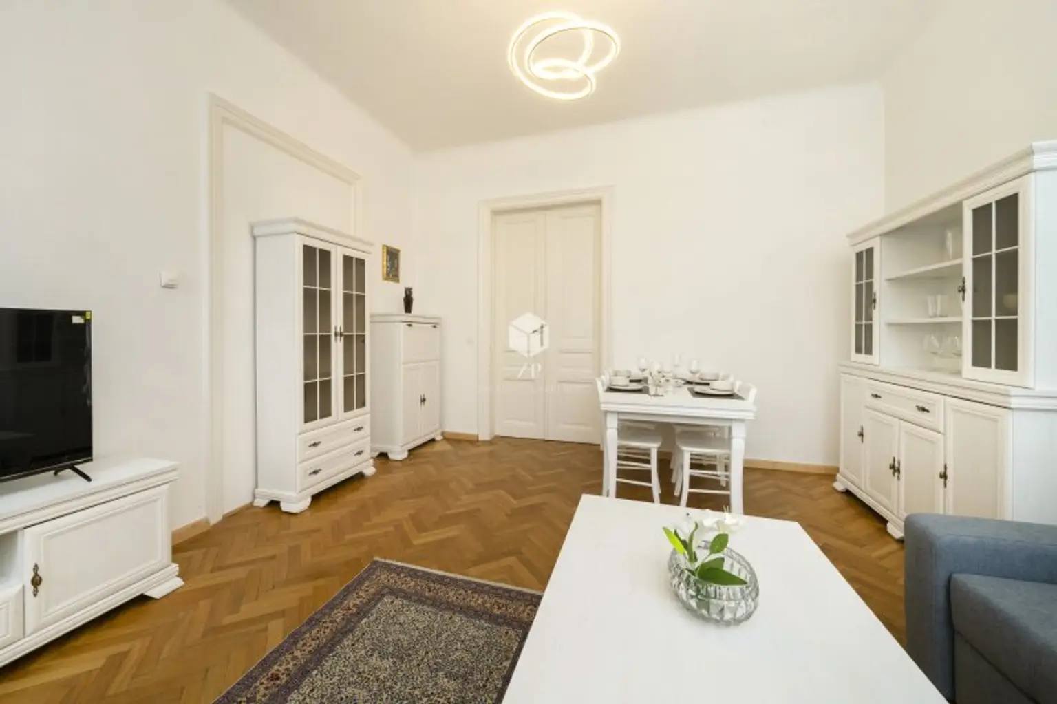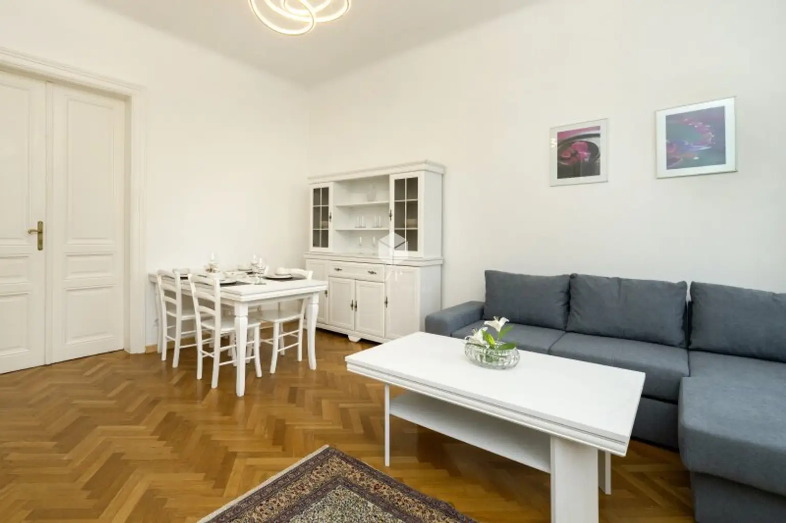Im großen, hellen Wohnzimmer können Sie auf einer ausladenden Ledercouch relaxen und am Flat-TV das Programm Ihrer Wahl sehen. High-Speed-WiFi steht zur Verfügung und ist inkludiert. Der klassisch gestaltete Essbereich bietet Ihnen Platz für bis zu sechs Personen. In dieser Alt-Wien-Kredenz finden Sie originales Vintage-Geschirr für Ihr perfektes Gäste-Dinner.