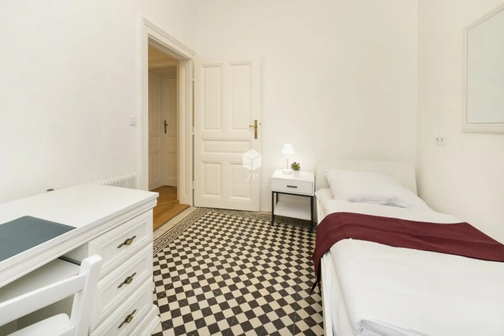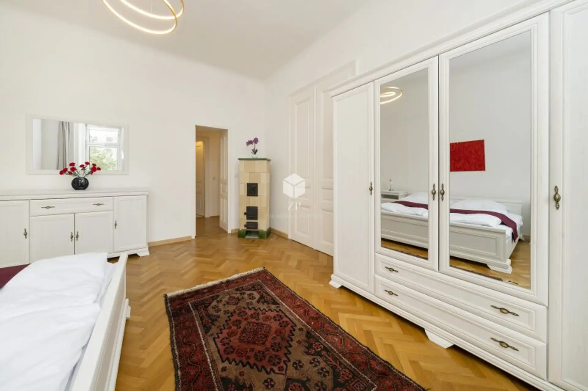 Das Hauptschlafzimmer verfügt über ein King-Size-Doppelbett. Ein großer Spiegelschrank im Stile Alt-Wien bietet ausreichend Stauraum. Kommoden vervollständigen die großzügige Einrichtung. Bettwäsche und Bettwaren sind vorhanden.