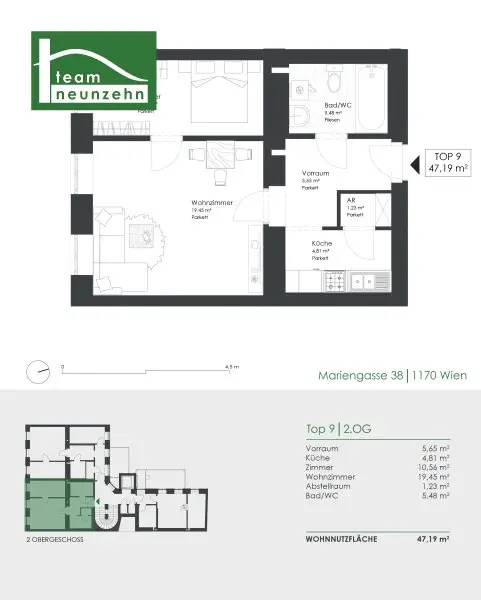 Die 2-Zimmer Wohnung Top 9 mit ca. 47,19 m² befindet sich im 2. OG mit Lift und teilt sich wie folgt auf:
