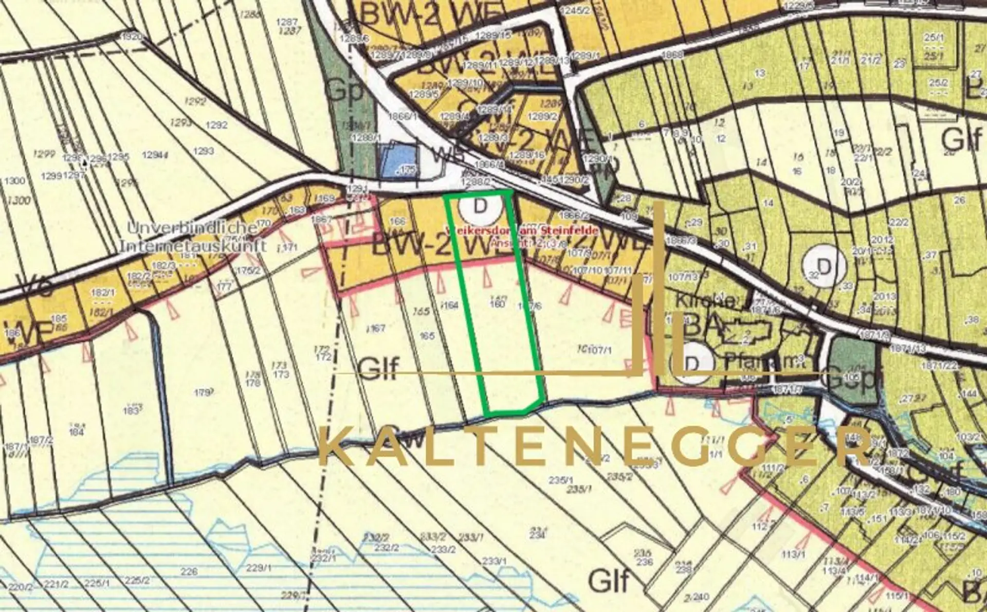 * BW-2WE (Bauland: Wohngebiete) ca. 1700 m²; der Rest der Grundstücksfläche ist als "Glf" (Grünland: Land- und Forstwirtschaft) gewidmet.