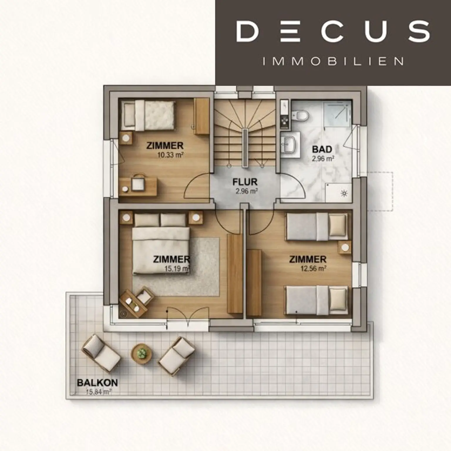 Im Obergeschoss erwarten Sie drei großzügige Schlafzimmer, zwei davon mit eigenem Balkon. Ein modernes Badezimmer schafft hier Ihre persönliche Wohlfühloase.