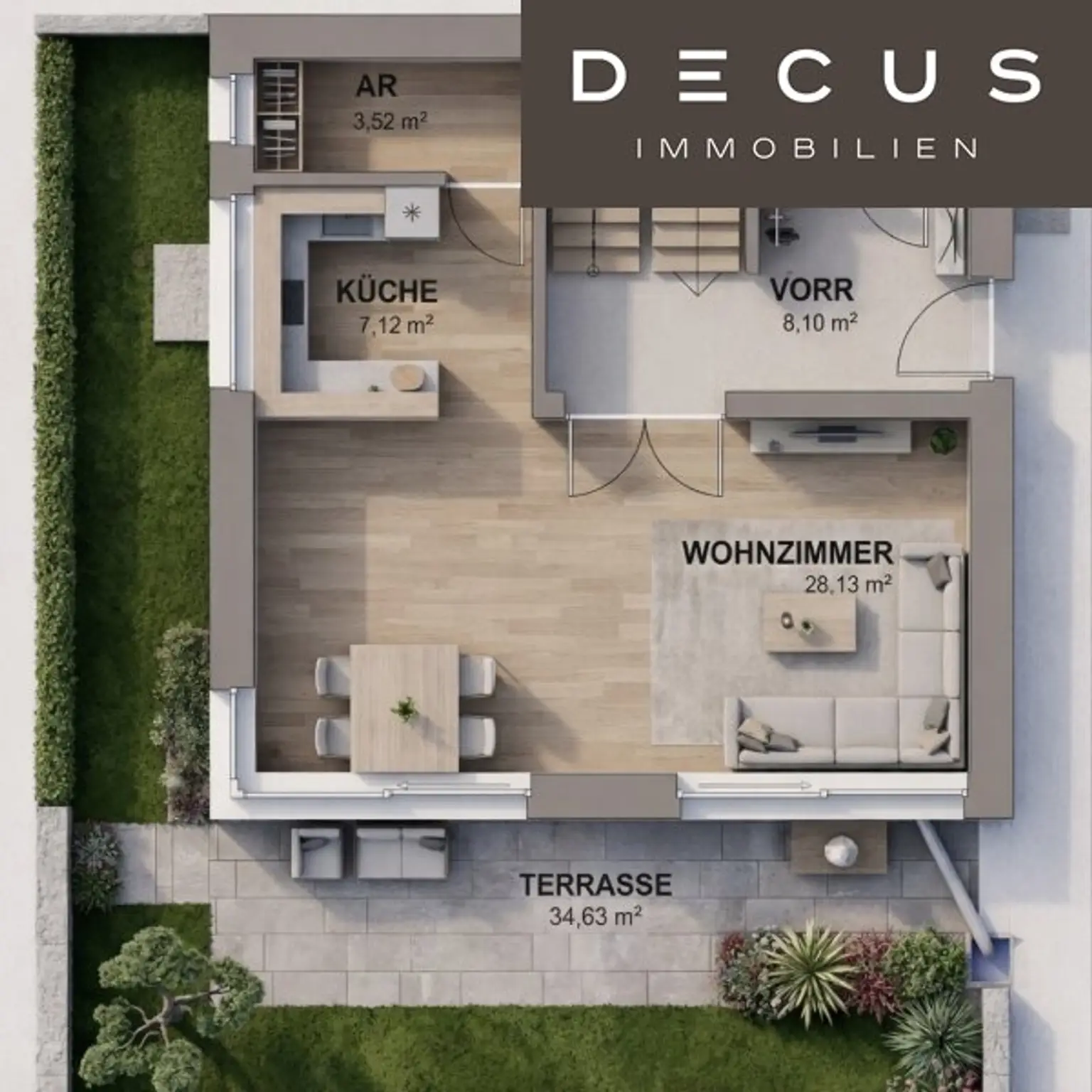 Bereits das Erdgeschoss überzeugt mit einem offenen, lichtdurchfluteten Wohn- und Essbereich, der ein einladendes Ambiente für Familie und Gäste schafft. Eine praktische Abstellkammer sowie ein Gäste-WC ergänzen diese Ebene perfekt.