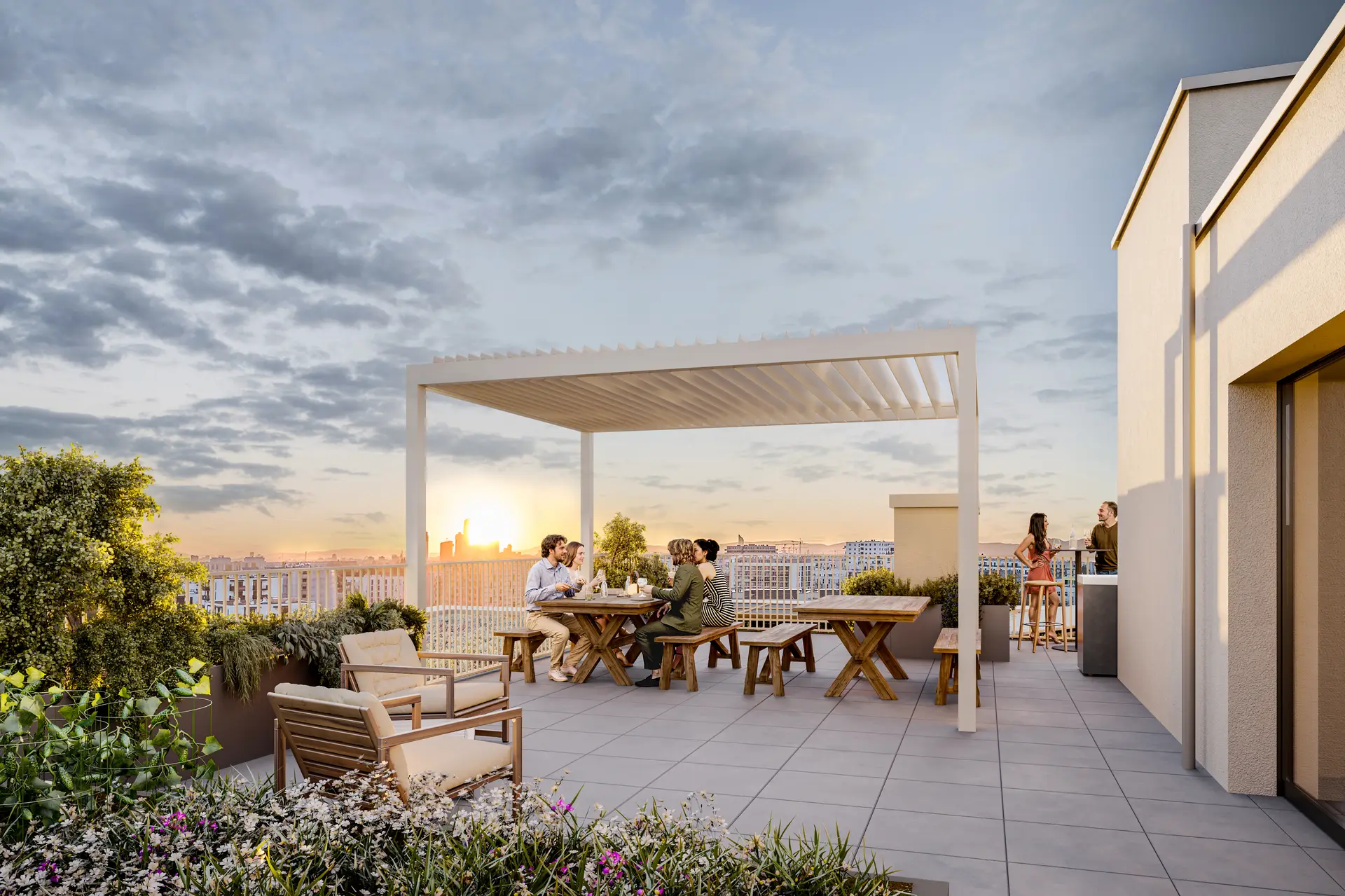 Großzügige Balkone und Terrassen mit integrierten Pflanzmöglichkeiten erweitern den Wohnraum ins Freie und laden zur Gestaltung persönlicher Grünoasen ein. Bodentiefe Fenster bringen viel Tageslicht in die Wohnungen und schaffen fließende Übergänge zwischen Innen- und Außenbereich. Zusätzlich stehen auf den Dachflächen individuell erwerbbare Garten- und Hochbeete zur Verfügung – ideal für alle, die Freude an urbanem Gärtnern haben. Gemeinschaftliche Freiflächen mit Sitzmöglichkeiten und Pergola bieten Platz für Erholung und Begegnung mit beeindruckendem Ausblick. Ein begrünter Innenhof mit vielfältigen Spiel- und Aufenthaltsmöglichkeiten ergänzt das Angebot und sorgt für hohe Aufenthaltsqualität direkt im Haus.