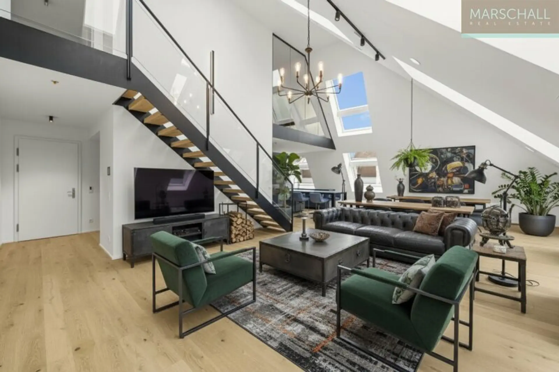 Die Wohnebene besteht aus einem beeindruckenden Wohnsalon mit bis zu ca.5 m Raumhöhe mit offenem Kamin und vollausgestatteter Wohnküche, einem Schlafzimmer mit ensuite Badezimmer, Eingangsbereich, Gäste WC und Wirtschaftsraum.