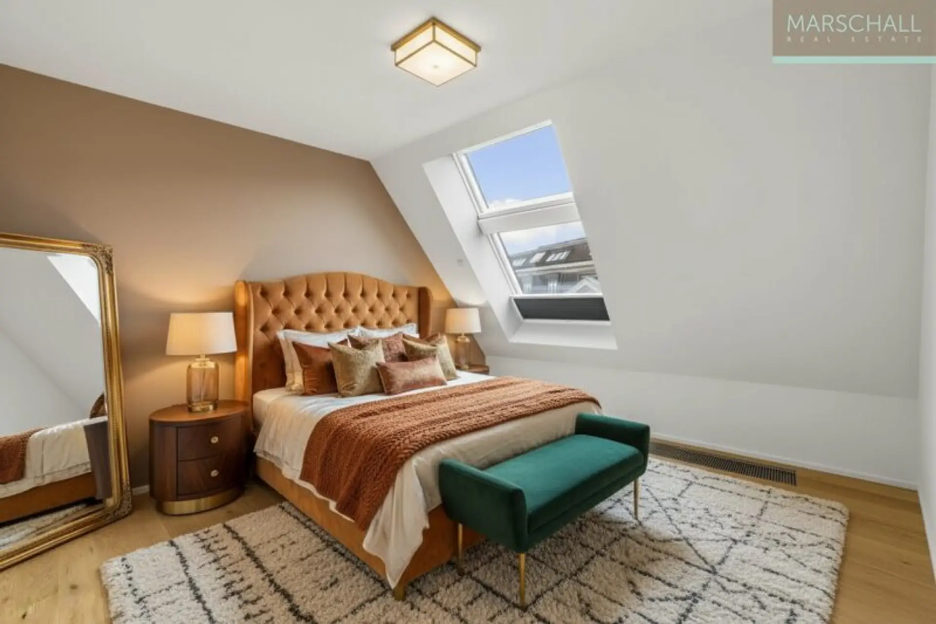 Im oberen Geschoss befinden sich der Masterbereich mit Schlafzimmer und Bad sowie ein weiteres Zimmer mit Duschbad.