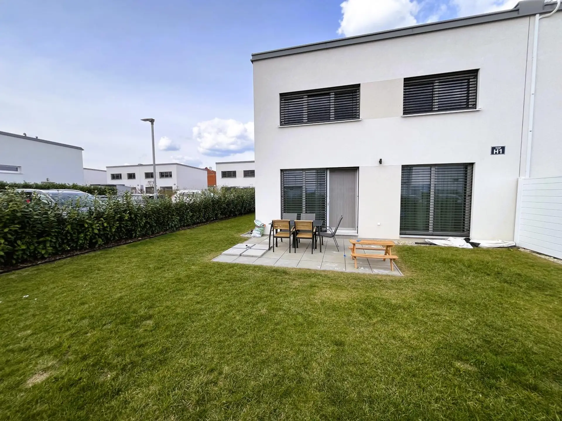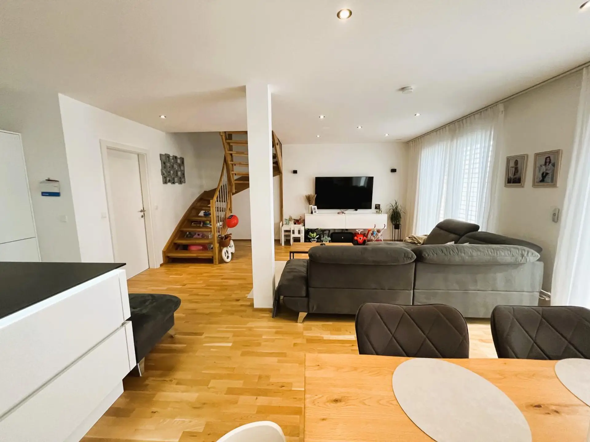 Die offene Wohn-Essküche bildet das repräsentative Herzstück des Hauses und öffnet sich zur Terrasse sowie in den privaten Eigengarten – ein fließender Übergang zwischen Innen- und Außenraum.